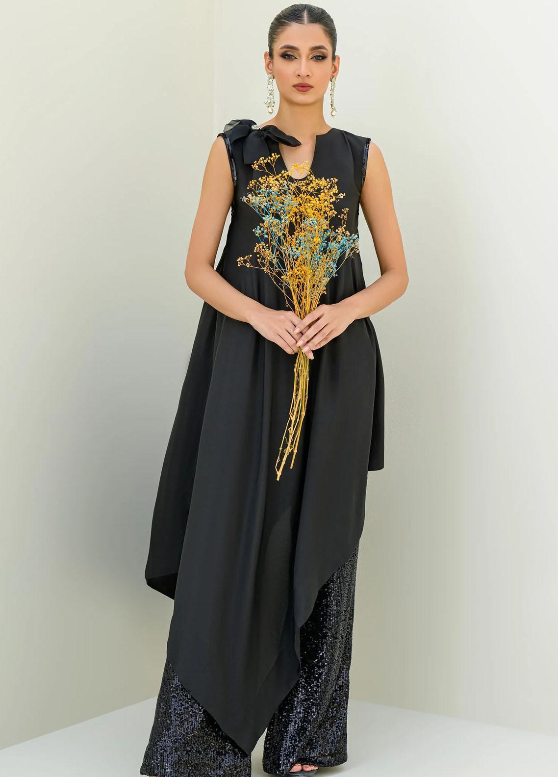 This top made in black crepe silk fabric features crew neckline adorned with floral brooch detail & crystals, Asymmetric hemline with flare Length. This stunning ensemble is paired with an interesting boot cut pants with sequences detail throughout. Rock in this article for your formal dinners & get-togethers.
