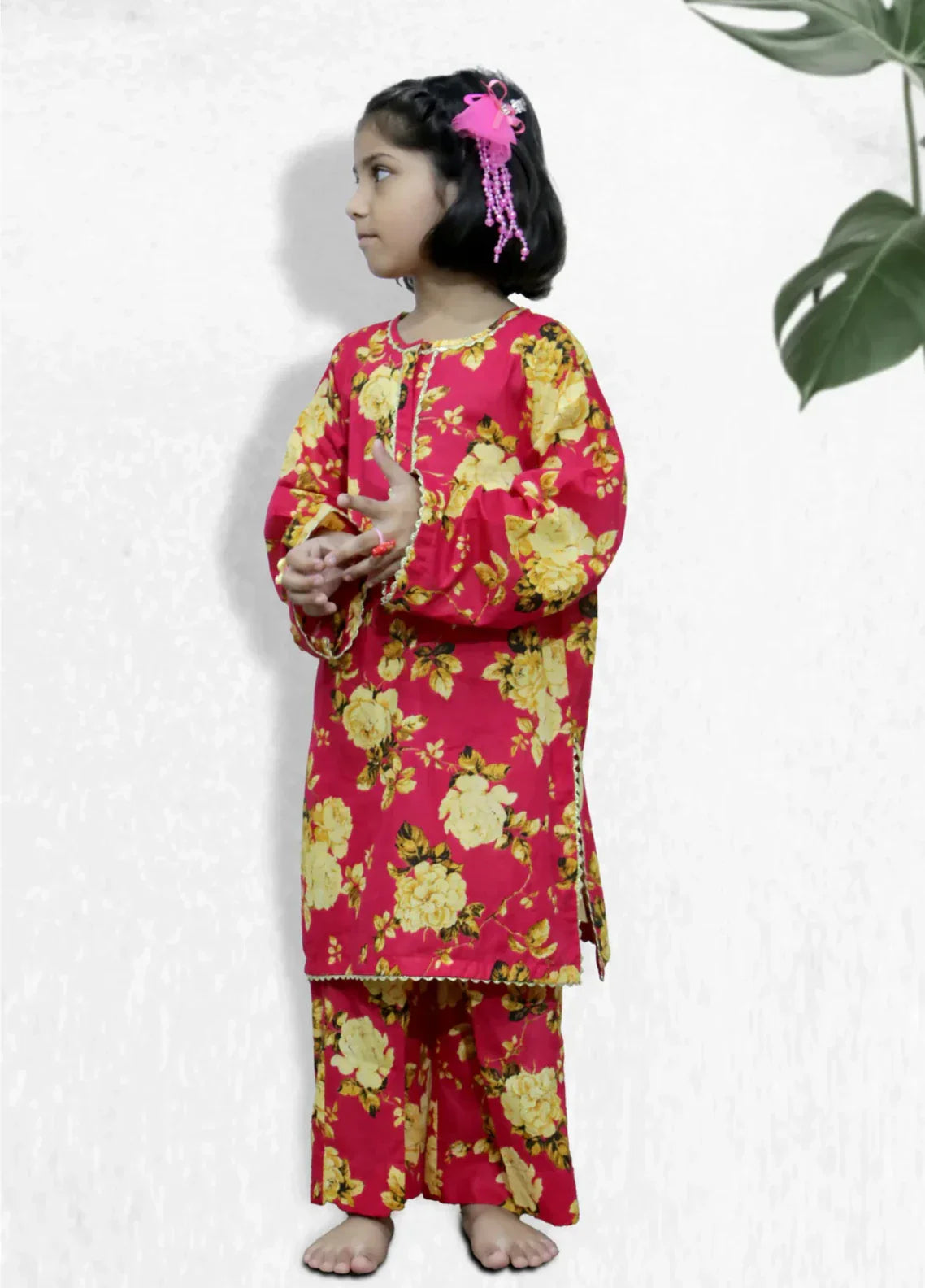 A vibrant two-piece girls’ set featuring a straight-cut kurta with tassel detail, long sleeves, and a bold red base with yellow floral print. Made from soft, breathable fabric with matching pants for everyday style and comfort.
