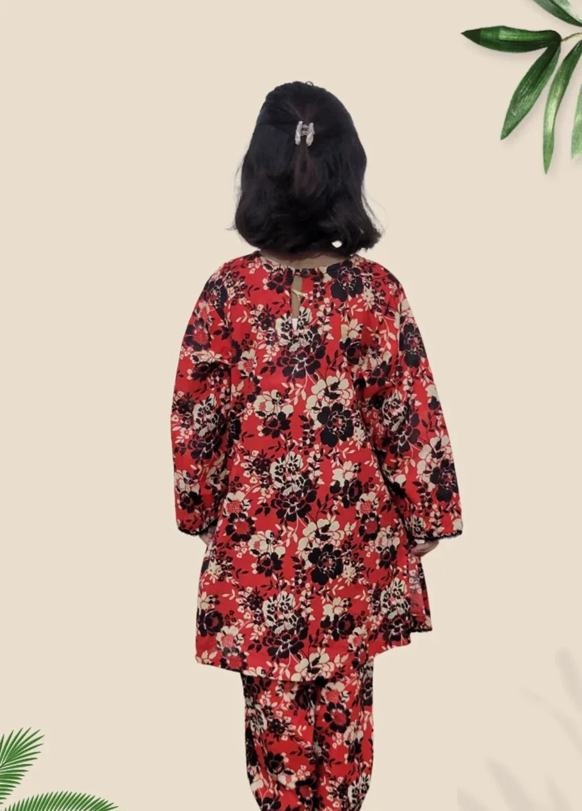 Girls’ blue floral suit with black lace trim neckline and white tassel details, paired with matching trousers.