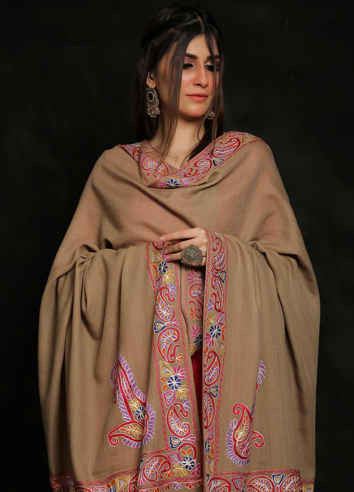 Sanaulla Exclusive Range Embroidered Pashmina Shawl MIR-276 Brown - Pashmina Shawls