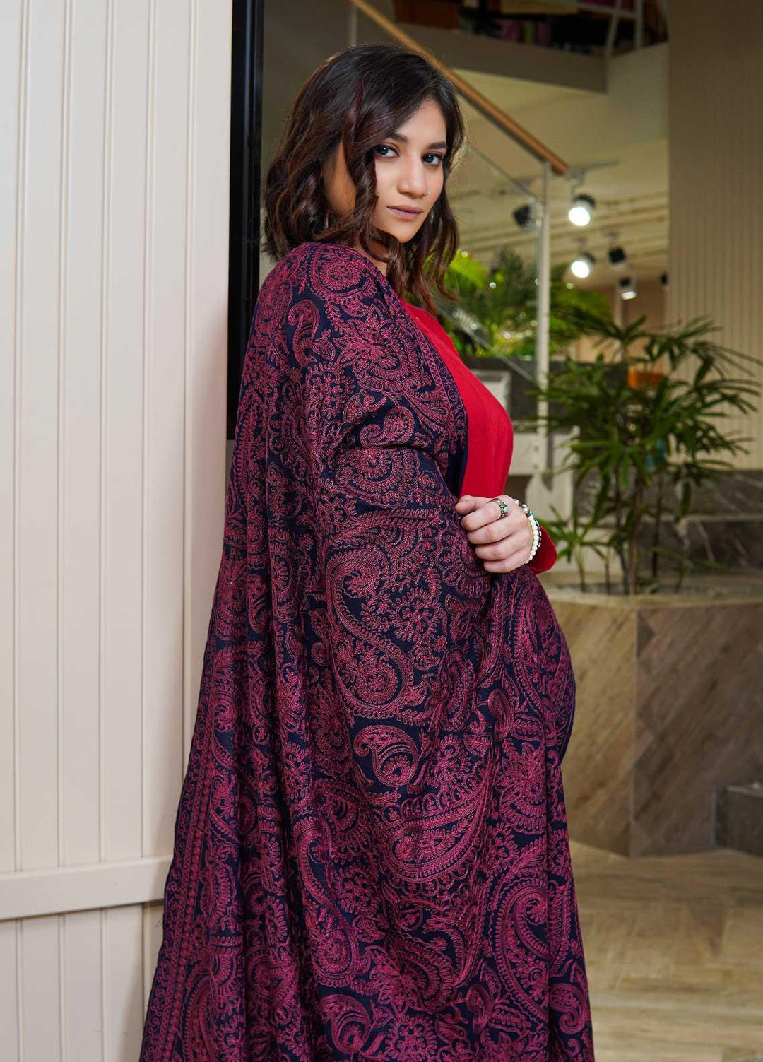 Sanaulla Exclusive Range Pashmina Shawls Shadow Emb Paala KPS-08 Red01 - Pashmina Shawls