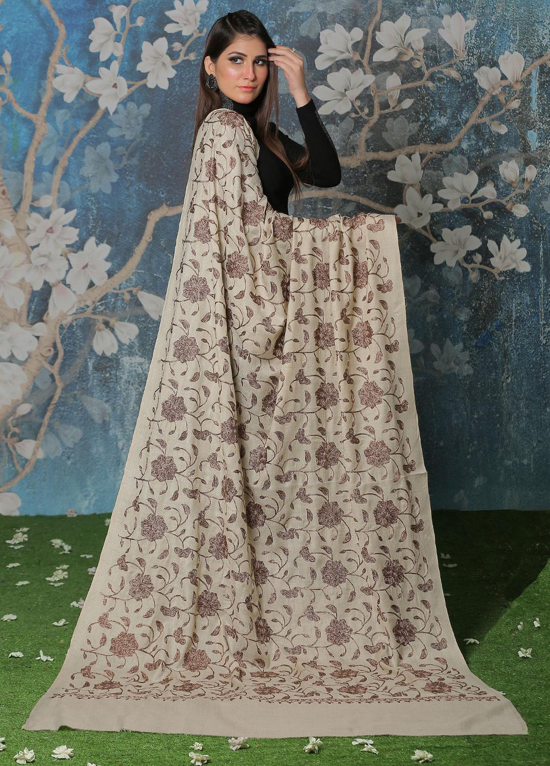 Sanaulla Exclusive Range Embroidered Pashmina Shawl SU21PP AKP-01 Cream-1 - Pure Pashmina Shawls