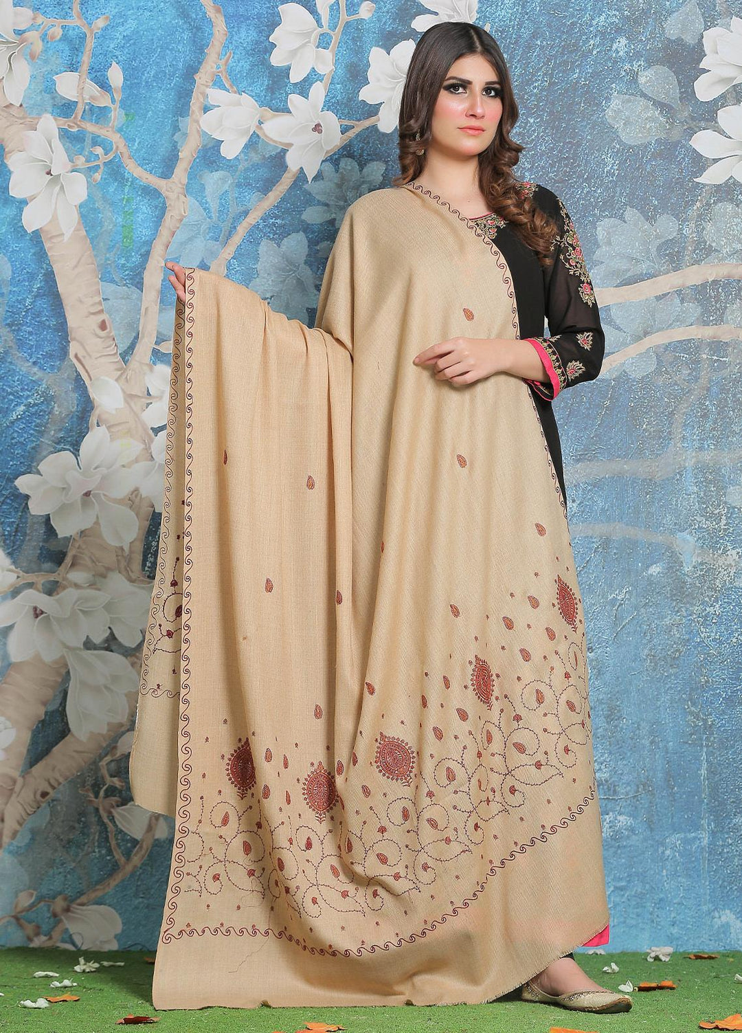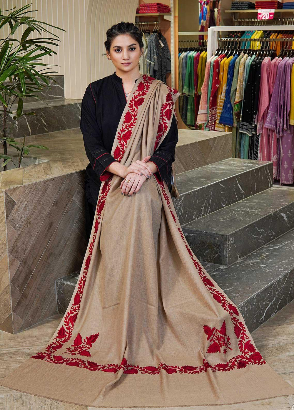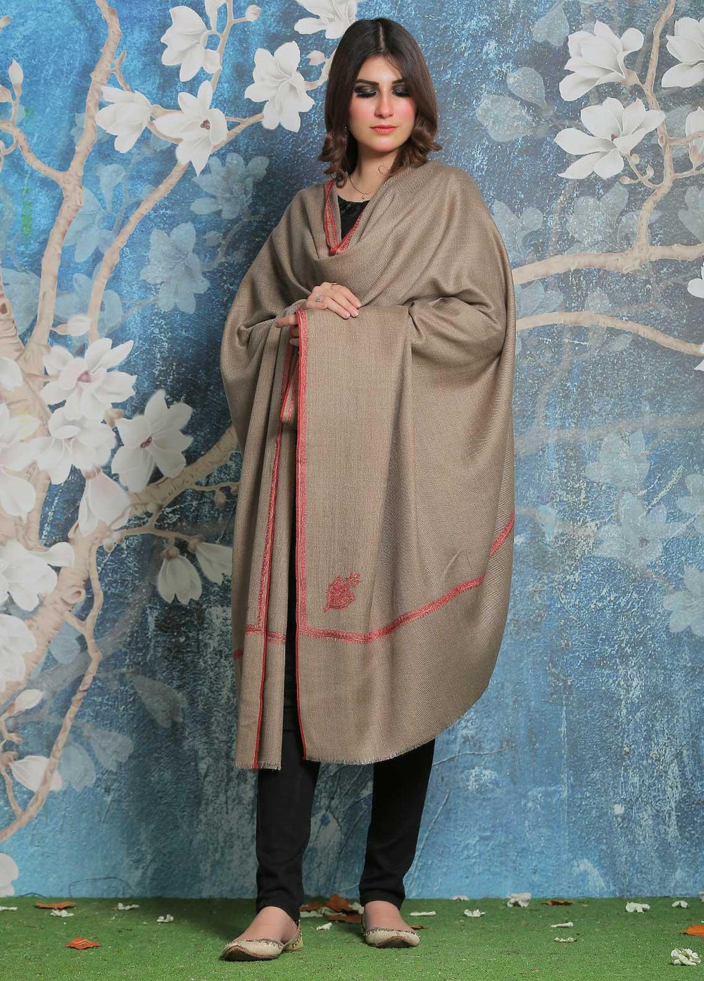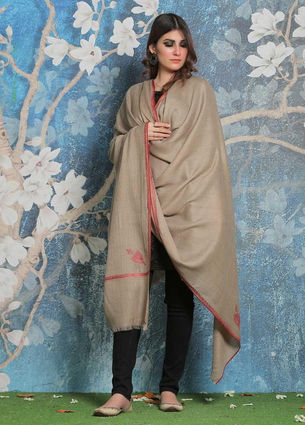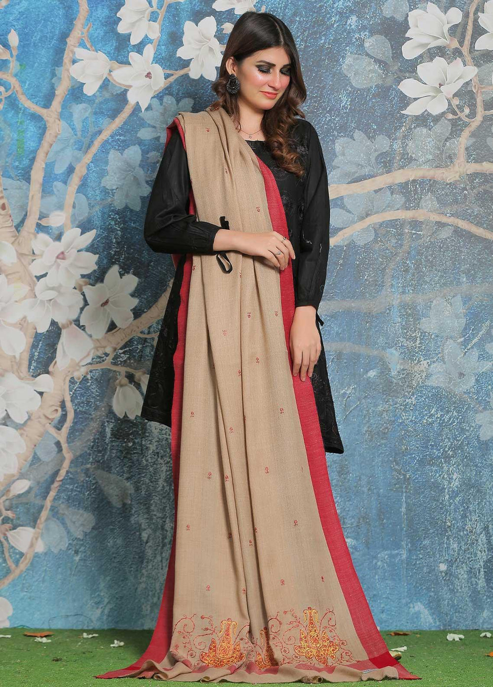 Sanaulla Exclusive Range Embroidered Pashmina Shawl MIR-65 Fawn/Red - Pashmina Shawls