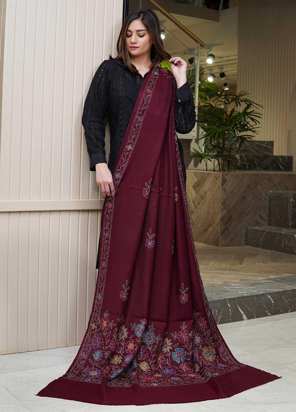 Sanaulla Exclusive Range Pashmina Shawls Shadow Emb Paala KPS-08 Mahroon - Pashmina Shawls
