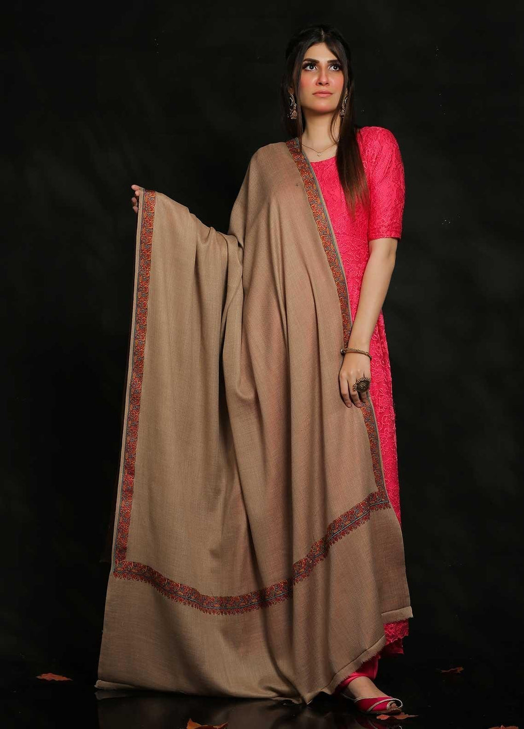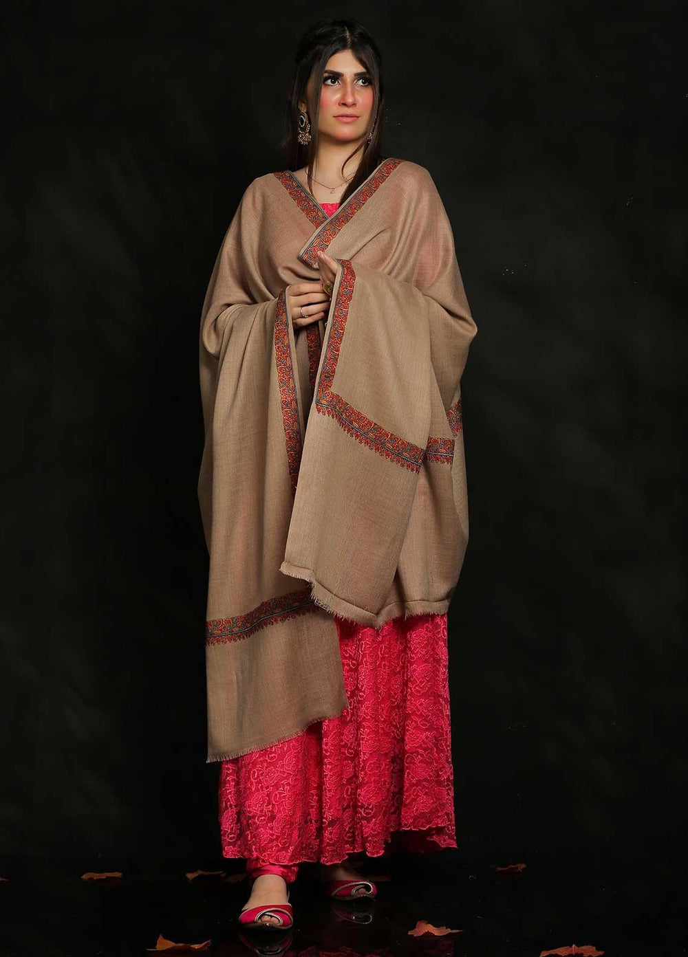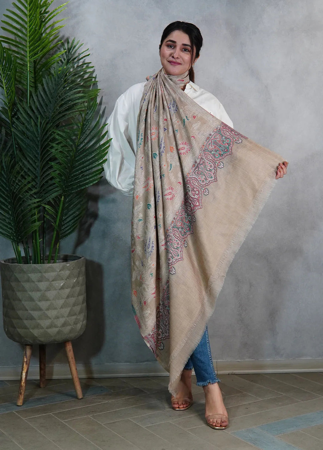 Sanaulla Exclusive Range Embroidered Pashmina Shawl AKP-27 Fawn-7 - Pashmina Shawls