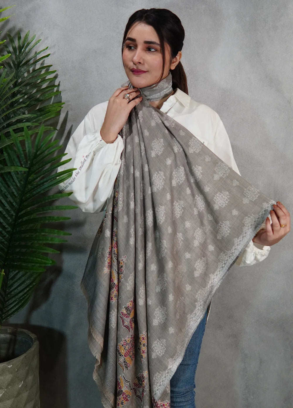 Sanaulla Exclusive Range Embroidered Pashmina Shawl AKP-52 Grey-3 - Pashmina Shawls