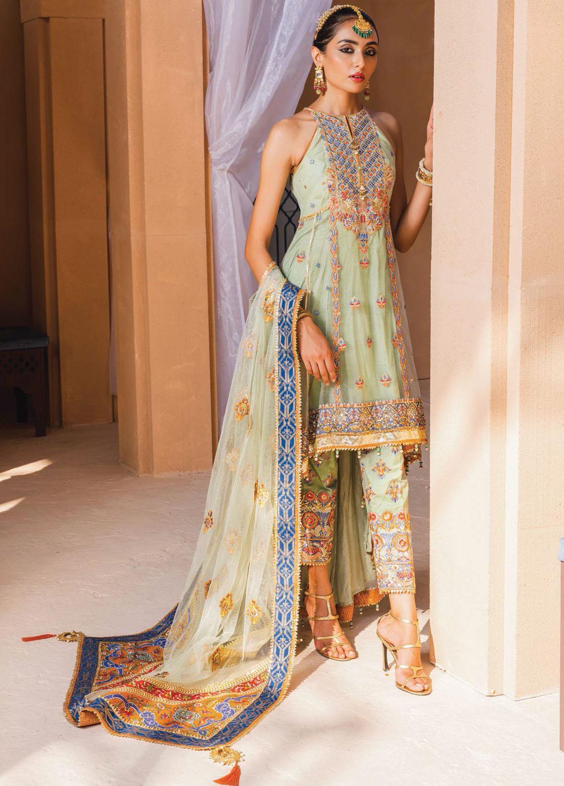 A serene mint green canvas is delicately accentuated with intricate floral and ornamental embroideries with an elaborately crafted neckline in exotic shades of orange, blue and gold. It is paired with a beautifully complimenting digitally printed gharara and an embroidered net dupatta that is adorned with complimenting embroideries and a contrasting cobalt blue border