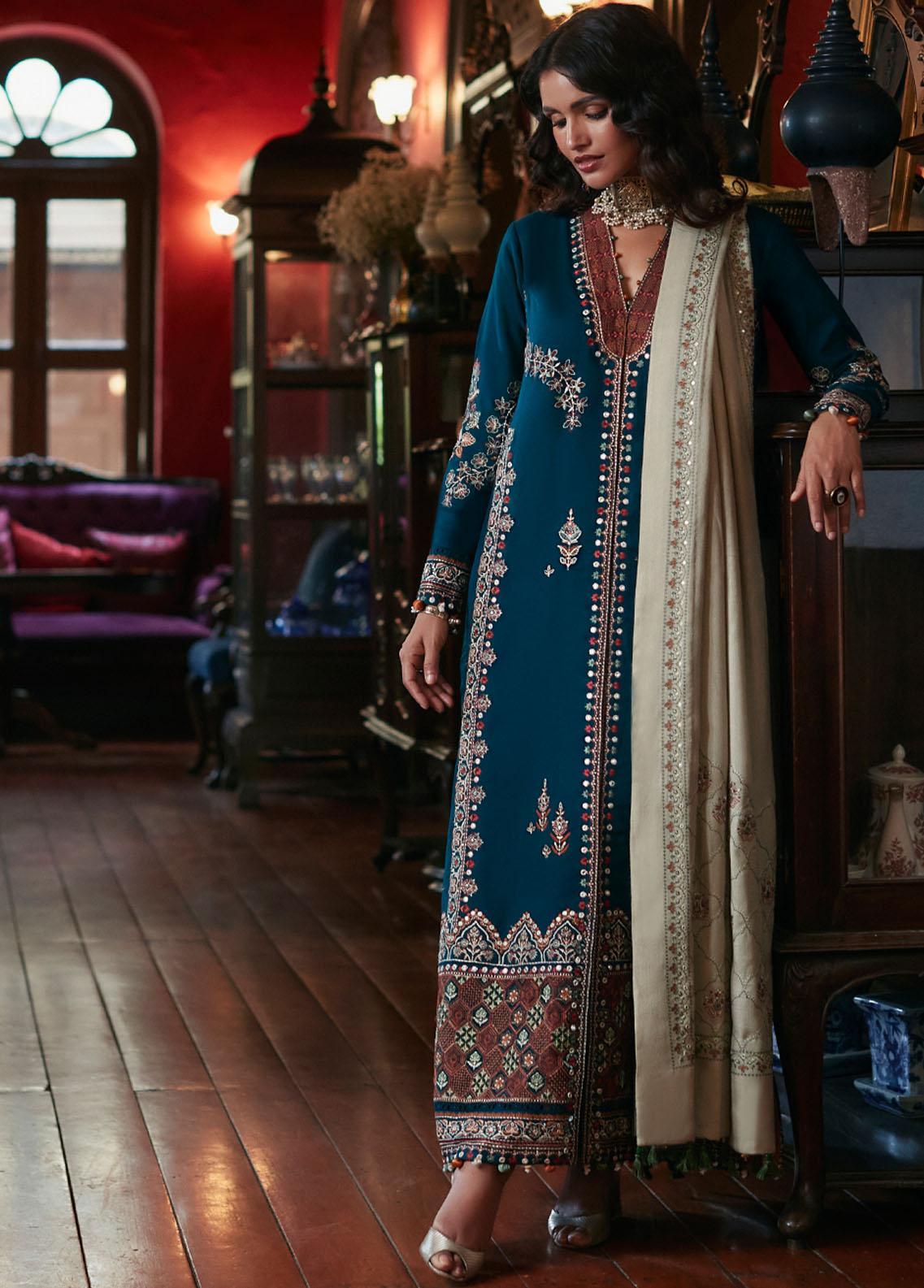 A sensuous, teal canvas is luxuriously layered with tribal elements in sumptuous shades of scarlet, tangerine, cerulean, russet and ivory in Jehan. Featuring an artsy blend of indigenous bottis and tribal elements this designer epitomises a classic understated sophistication. The deep jewelled shirt is offset by a sagey beige shawl emblazoned with an intricate jaali completing the look to perfection