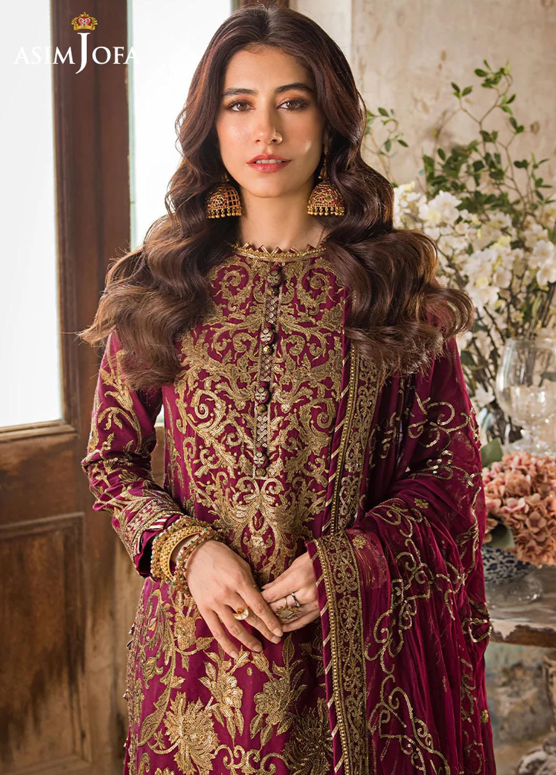Syra Yousuf looks majestic dressed in this deep maroon attire. Festooned with antique gold zari and thread interlaced with matte sequins creating this sprawling design of paisleys and floral elements adding life on this deep tone. An intricately worked cutwork border runs along the shirt hem topped with embroidered chiffon dupatta and dyed trouser.