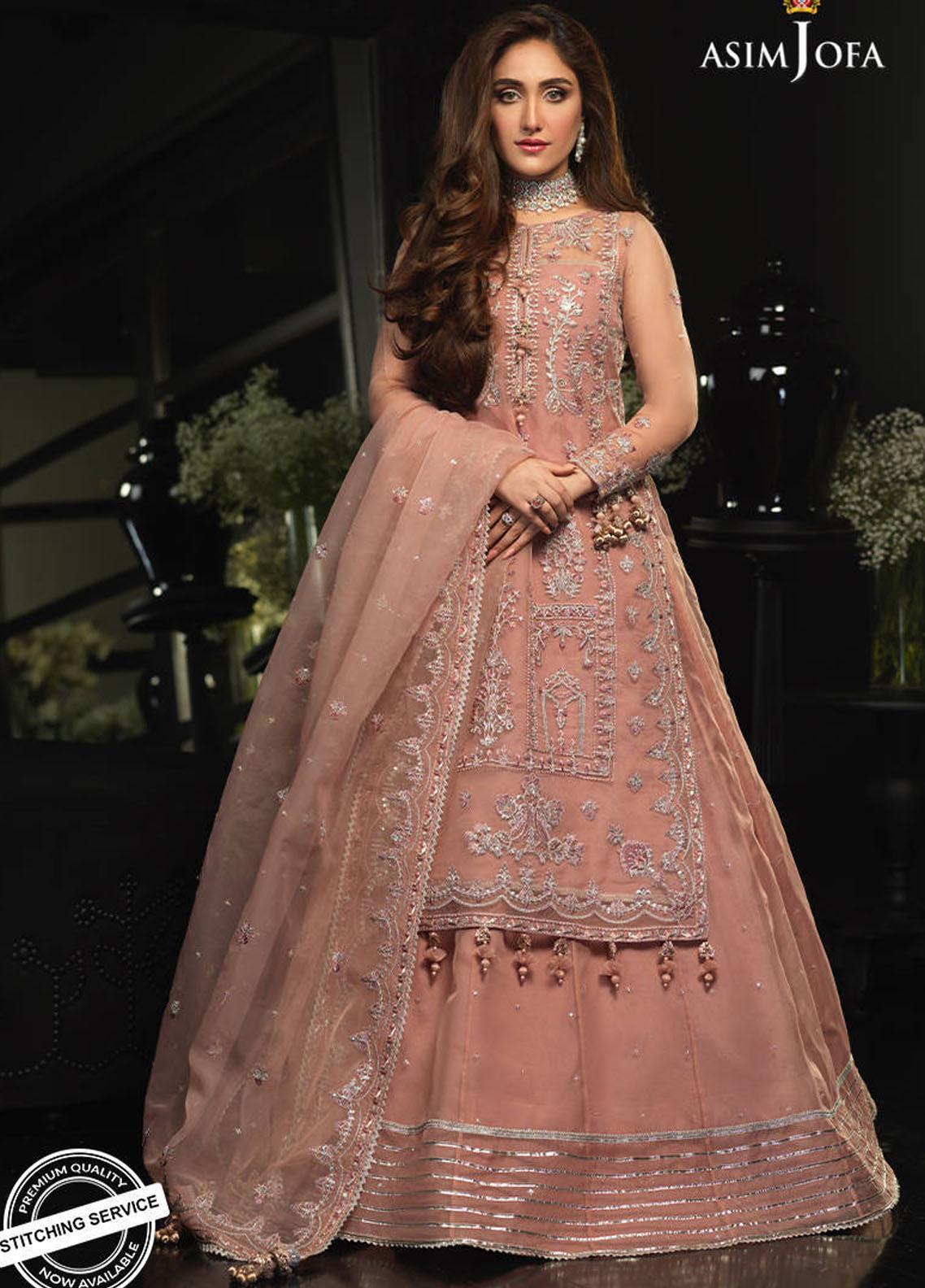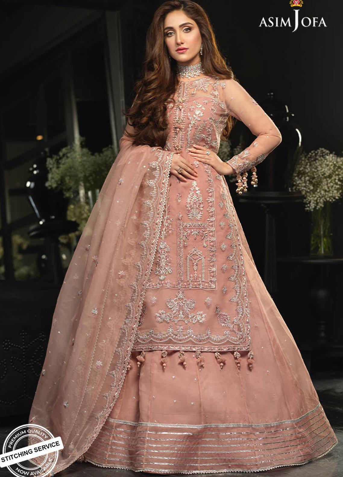 Get struck by Aizas stunning avatar in this breath taking design from Ishq-e-Naubahar. Clad in this beautiful dusty pink organza shirt worked in silver zari and badla and holographic sequins giving it a mesmerizing shine. The design is an asymmetrical pattern with floral imagery done with stunning detail. It is more dramatized by the addition of a heavily decked dupatta which is worked on four sided border and chan in middle with a lehnga sprinkled with spangles on organza. Dazzle all by donning this tasteful attire.