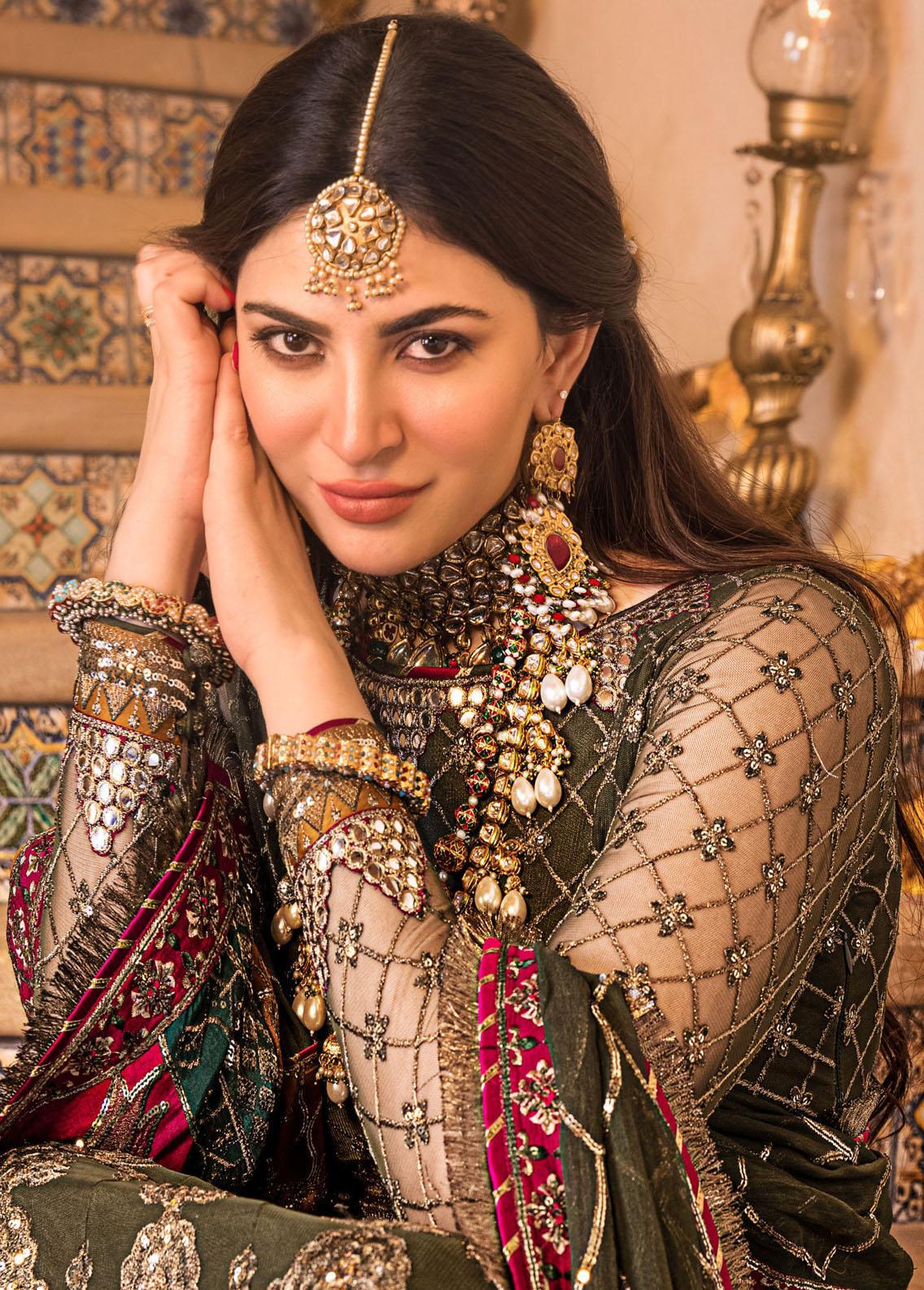 this outfit. The borders are adorned with beaming ornaments and multi colored details with lavish contrast of hot pink, gold and mustard to make this stunning dress an epitome of beauty. The dupatta incorporates beautifully designed borders on all four sides, focusing on the heavily embellished colorful pallu borders to give it a perfect maharani look. The charm of this ensemble will surely leave you spellbound with its impeccable design.