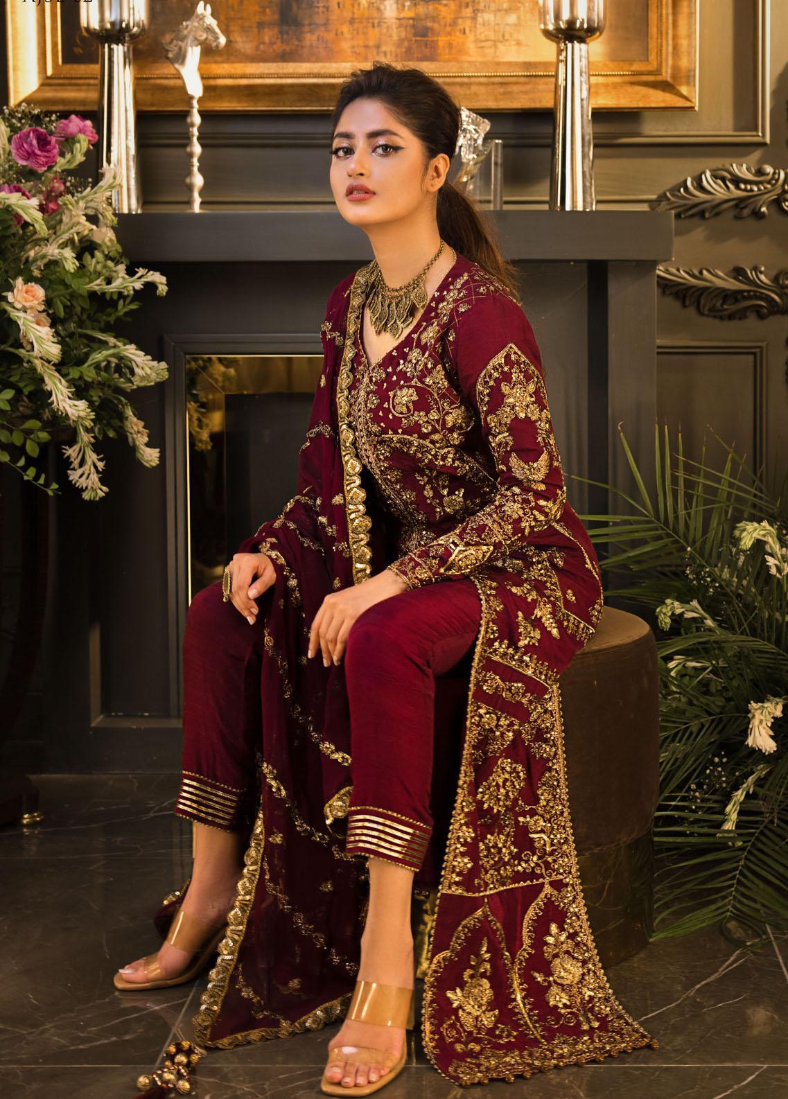 Sajal Aly is a vision to behold in this timeless front open ensemble in silk. The stunning design is curated to perfection as it features antique gold dori and cupped sequins work that is reminiscent of the age old craft of zardozi. The symmetrical pattern of arches and floral motifs give this design a classical look altogether. The elegant statement look is complete with matching dyed silk pants and a diagonal lined embroidered chiffon dupatta thus elevating the design to another level.