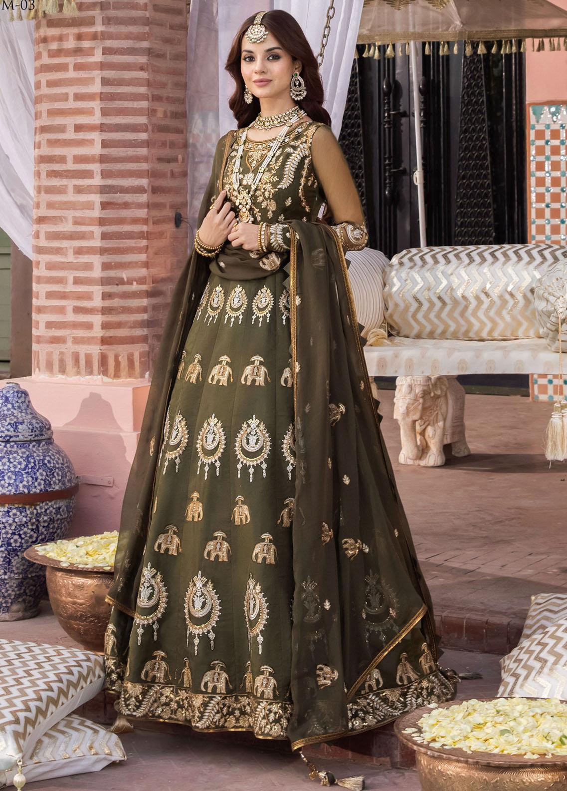 This festive season, be your royal highness in this kalidaar peshwas done on military green colour. The dress is crafted with zari and thread work. Hint of maroon is needled in thread work for the pop of colour. Elephant and chaand baali motif is done exquisitely. It is paired with dupatta that has small embroidered motifs all over it with dyed pants to complete your look for the evening.