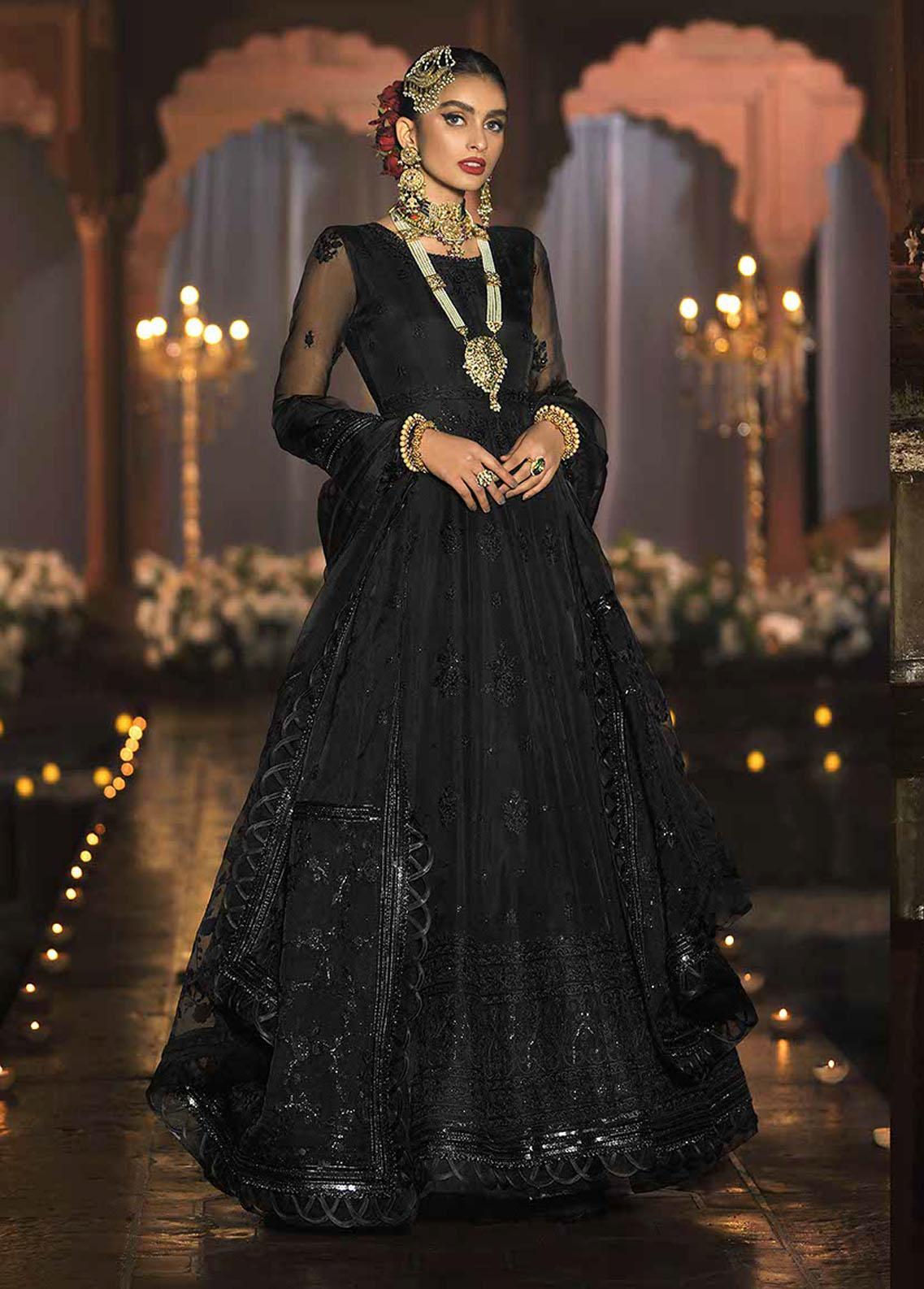 This luxurious monotone black Pishwas is a head turner for sure. At the height of graceful femininity, this look in black with an extravagant arrangement of sparkling sequins paired with same color thread suggests the regality of this shade with just a bit of that festive oomph. Elaborate border clad in sequins decorate the hems of this timeless piece. It is paired with cotton silk trousers and an embroidered dupatta with a floral jaal on pallus ornamenting the base from one end to the other. Perfect amount of elegant dazzle gives this design the festive vibrancy it deserves to be a showstopper.