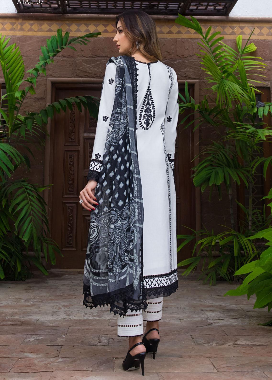 A lovely white canvas adorned with intricate embroidery enhances the outfits classic beauty. It is paired with matching pants and a beautifully composed printed chiffon dupatta, this stylish ensemble is sure to make a statement this summer.