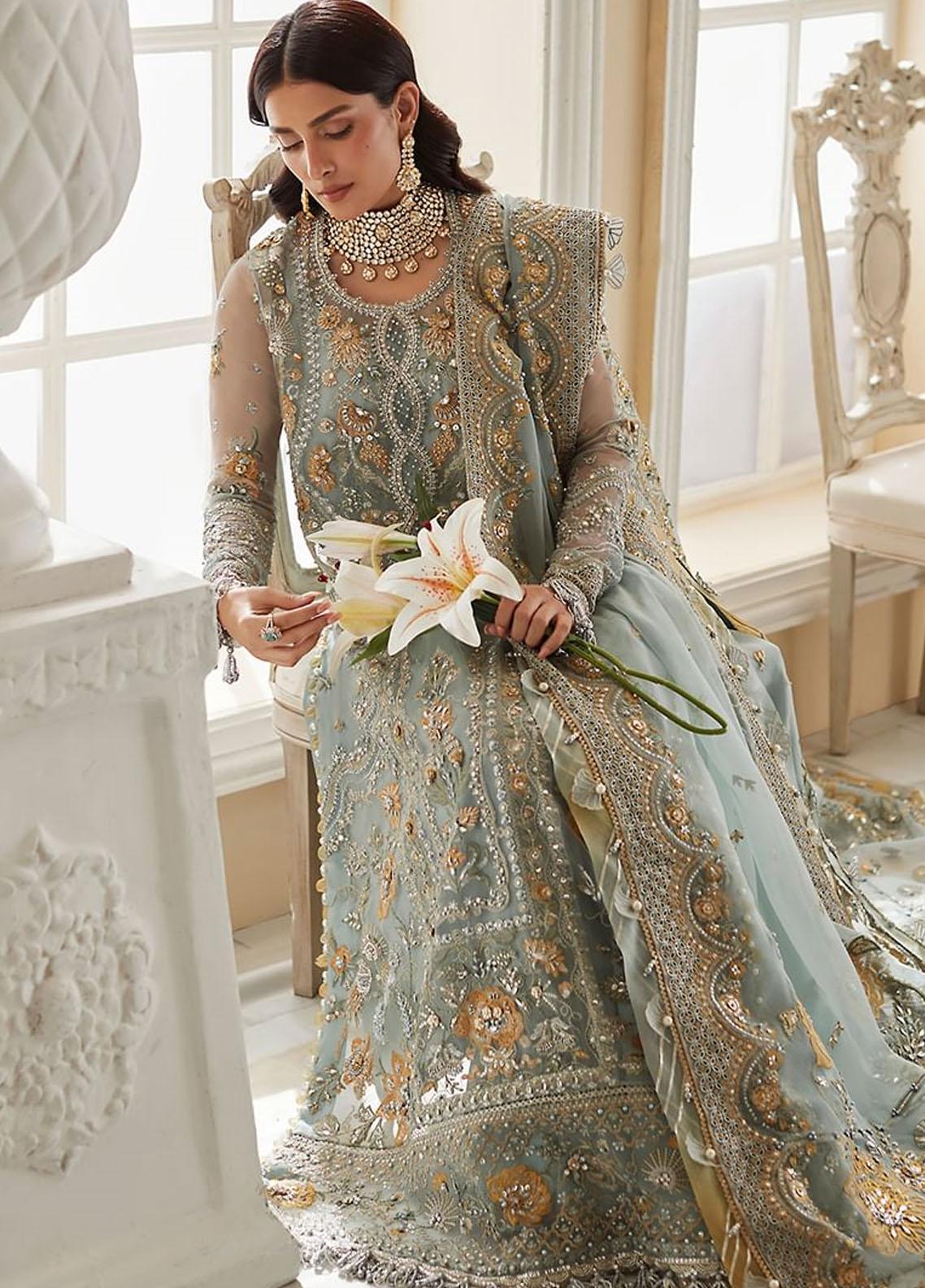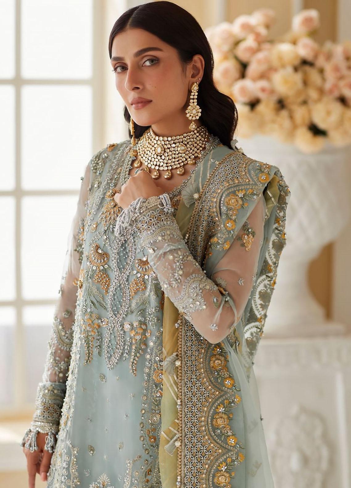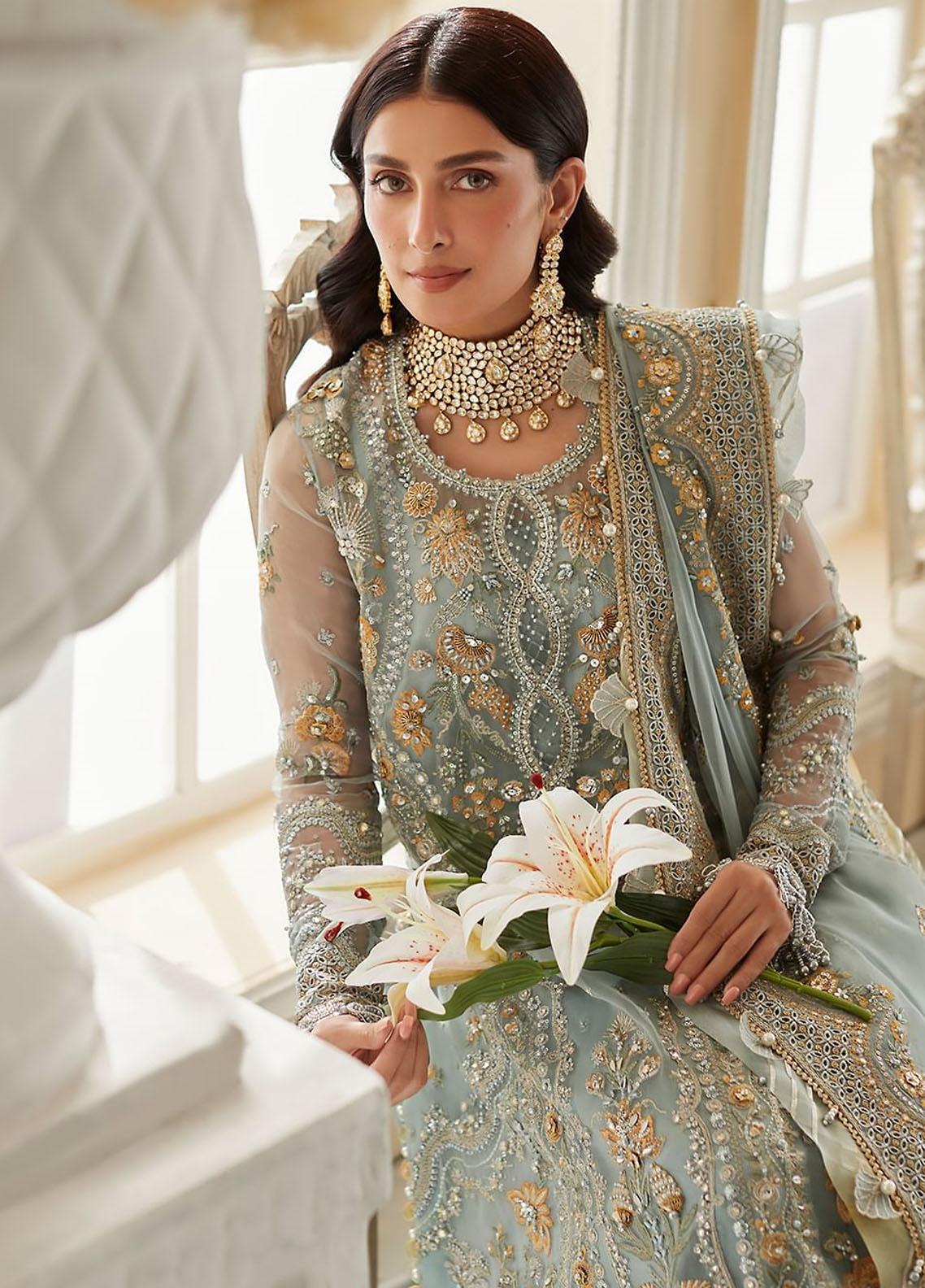 Get ready to sparkle in Esme an ethereal creation thats truly a work of art. Ice blue organza is enlivened with canary florals with hand applied iridescent details accentuating the artful composition. The delicate sequins, crystals, and seed pearls glisten on silken blooms and tinsel cut work lattice to create a mesmerising impact. The diaphanous organza dupatta features intricately embroidered festoons ensconced in gilded schiffly scallops held within grandly tapestried pallus, making the design an ultimate showstopper. With its understated elegance and timeless appeal, Esme is a treasure that youll cherish forever.