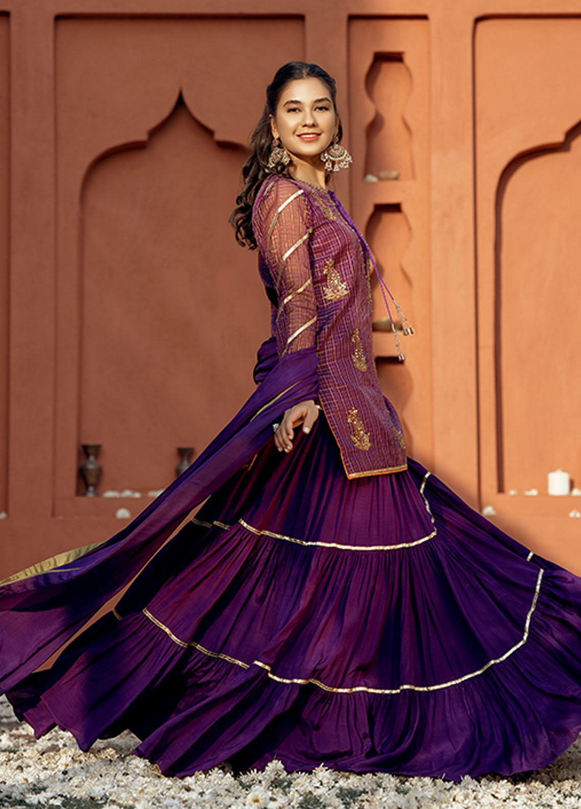 Flary and fun, this purple outfit is what you need for this season. A zari organza short shirt in purple with hand and resham embroidery paired with a voluminous ghaagra of pakistani raw silk with gota lace. This dress is paired with matching tissue silk dupatta and handmade tassels.TheseLuxury Formal Women Suits, Ready To Wear, wedding dresses, are perfect for your festive events. Choose from Zaaviay, your favourite online,Pakistani Clothing Brand
