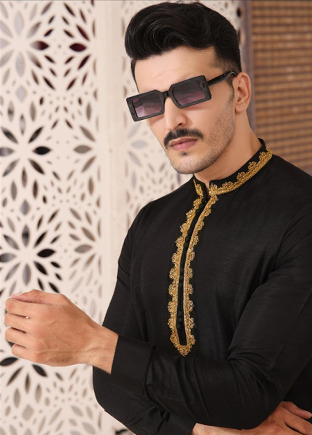Bazm E Riwayat by Bin Musab Men Kurta Pajama 2 Piece Raw Silk Signature Black - Festive Collection
