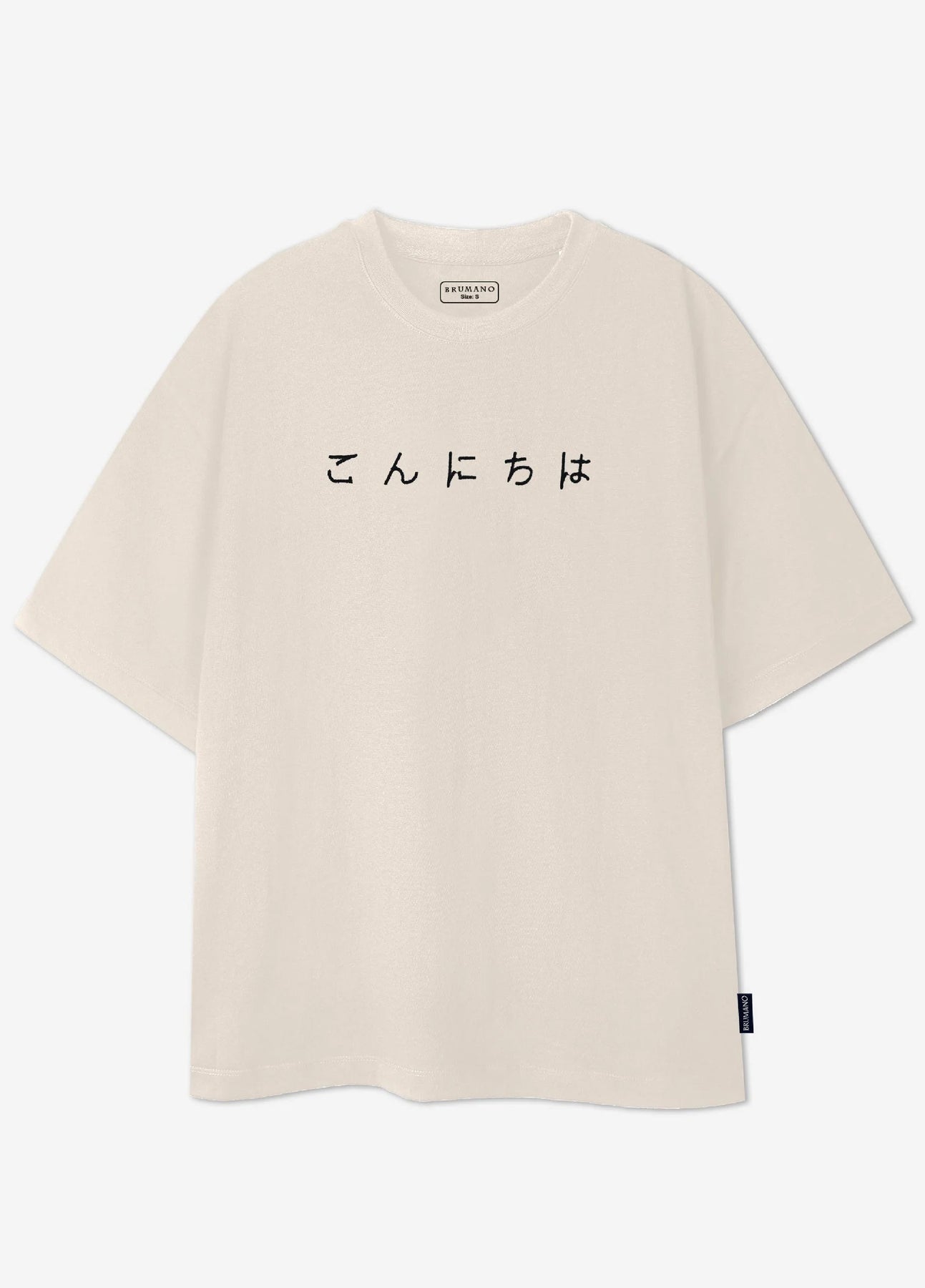 Elevate your everyday look with this beige oversized t-shirt featuring minimalist Japanese embroidery 'Hello'. Crafted from soft, breathable cotton, it offers a relaxed shoulder drop fit and subtle style perfect for modern streetwear look
