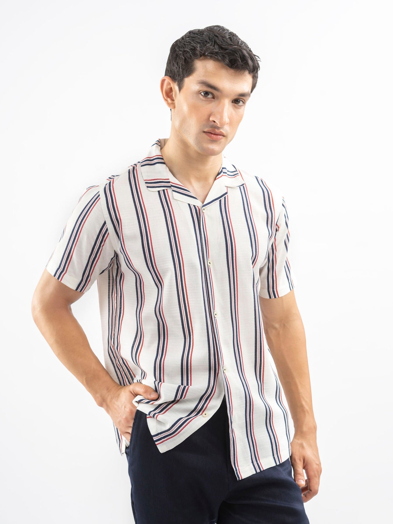 Stay effortlessly stylish in this beige & red striped cuban collar shirt for men. Made with lightweight, breathable fabric, it features a relaxed fit, bold vertical stripes, and an open collar for a laid-back summer vibe. Perfect for casual days or vacation looks.
