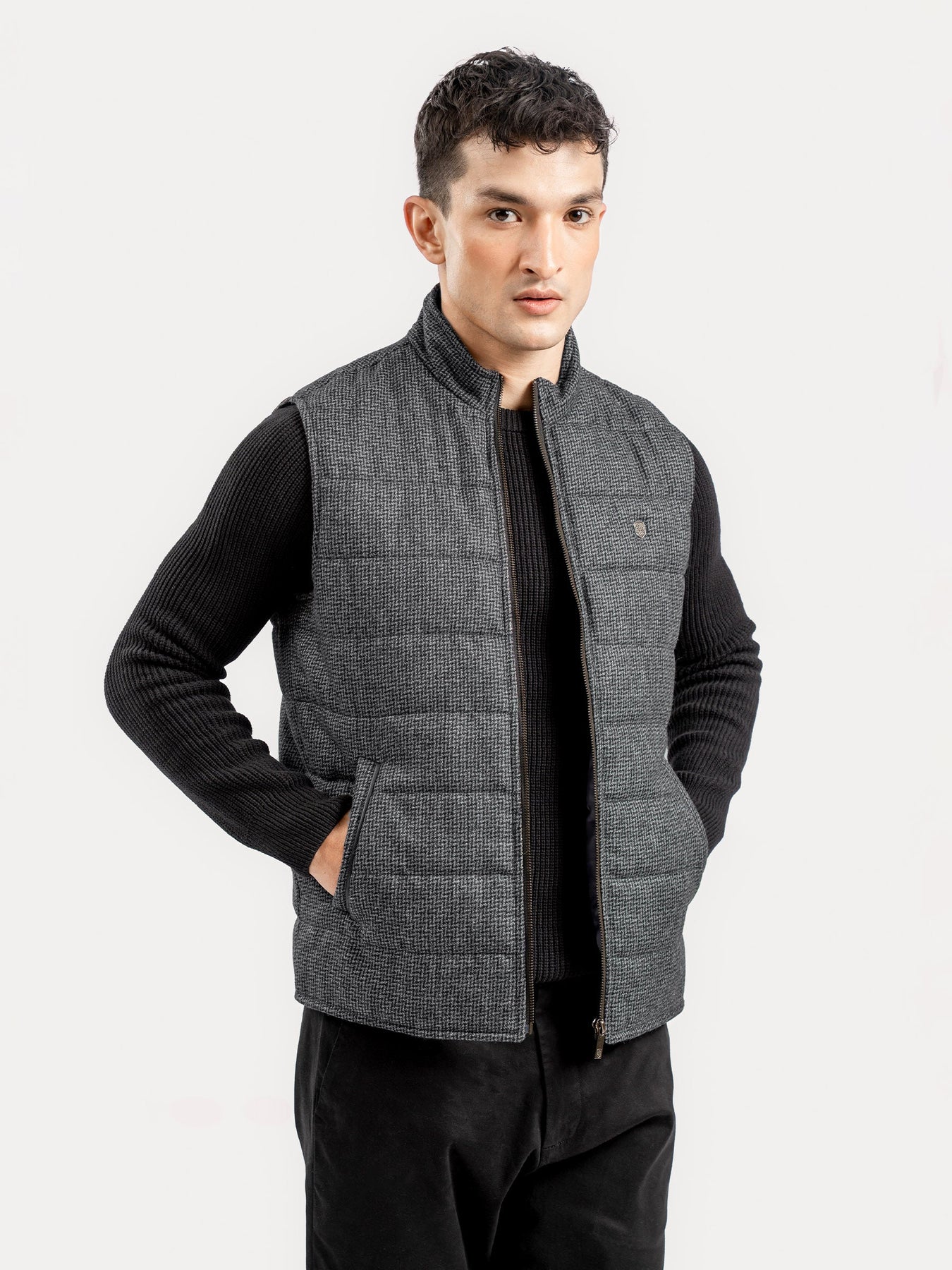 A sleek, grey & black patterned wool vest in tweed fabric, featuring a clean zipper front for effortless layering and modern style. Perfect for elevating everyday outfits.