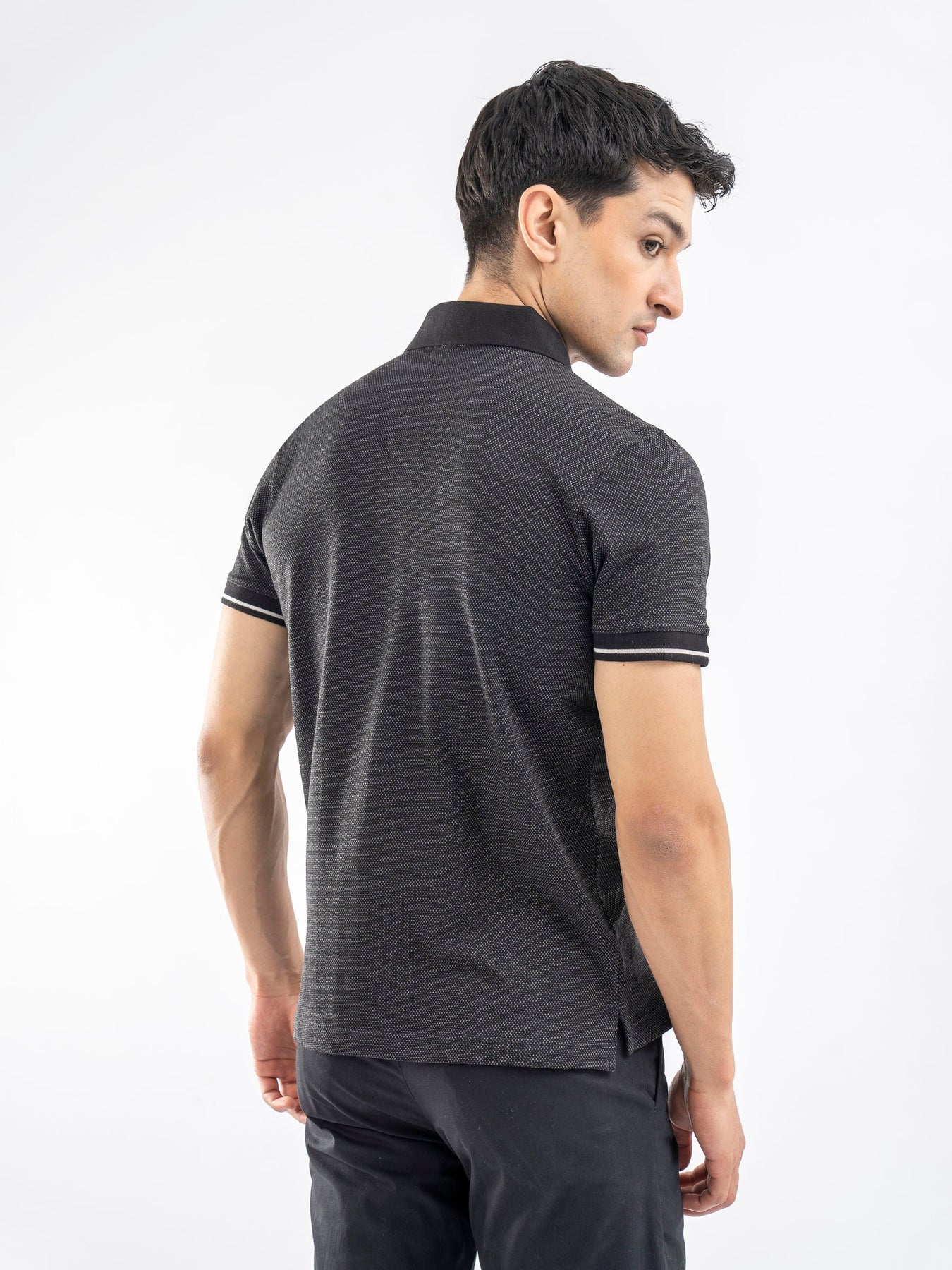 The black dobby structured polo combines classic style with modern sophistication. Crafted from a textured dobby fabric, this polo offers a structured fit with a subtle pattern that adds depth and elegance. Finished with ribbed contrasting cuff. Ideal for both casual and semi-formal occasions.