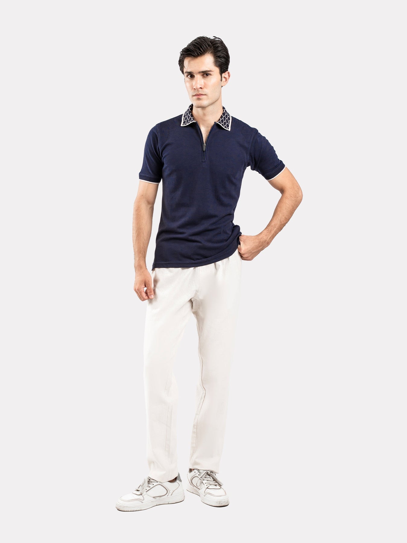Upgrade your everyday style with this navy blue zipper polo shirt featuring a jacquard collar. Made from high-quality pique fabric, this men's polo combines comfort with contemporary design. The stylish half-zip front adds a modern twist, while the textured jacquard collar brings a refined touch. Perfect for smart-casual looks, this navy blue polo shirt transitions seamlessly from day to night.