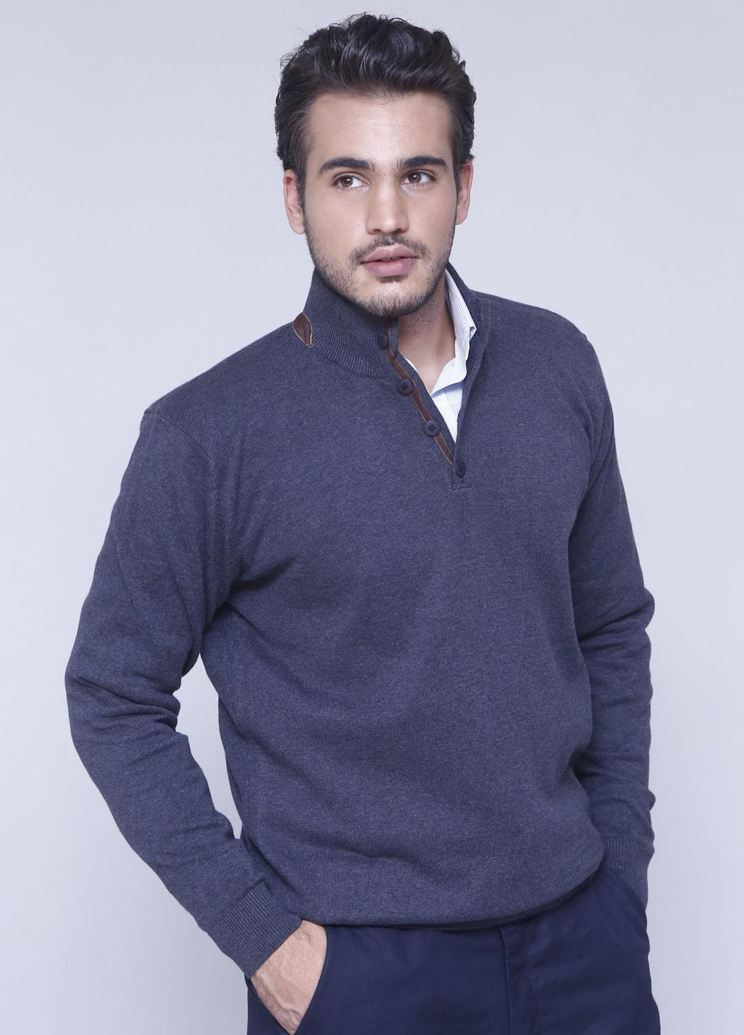 Brumano Cotton Casual Mens Sweaters - Dark Grey Full sleeve mock neck with leather detailing