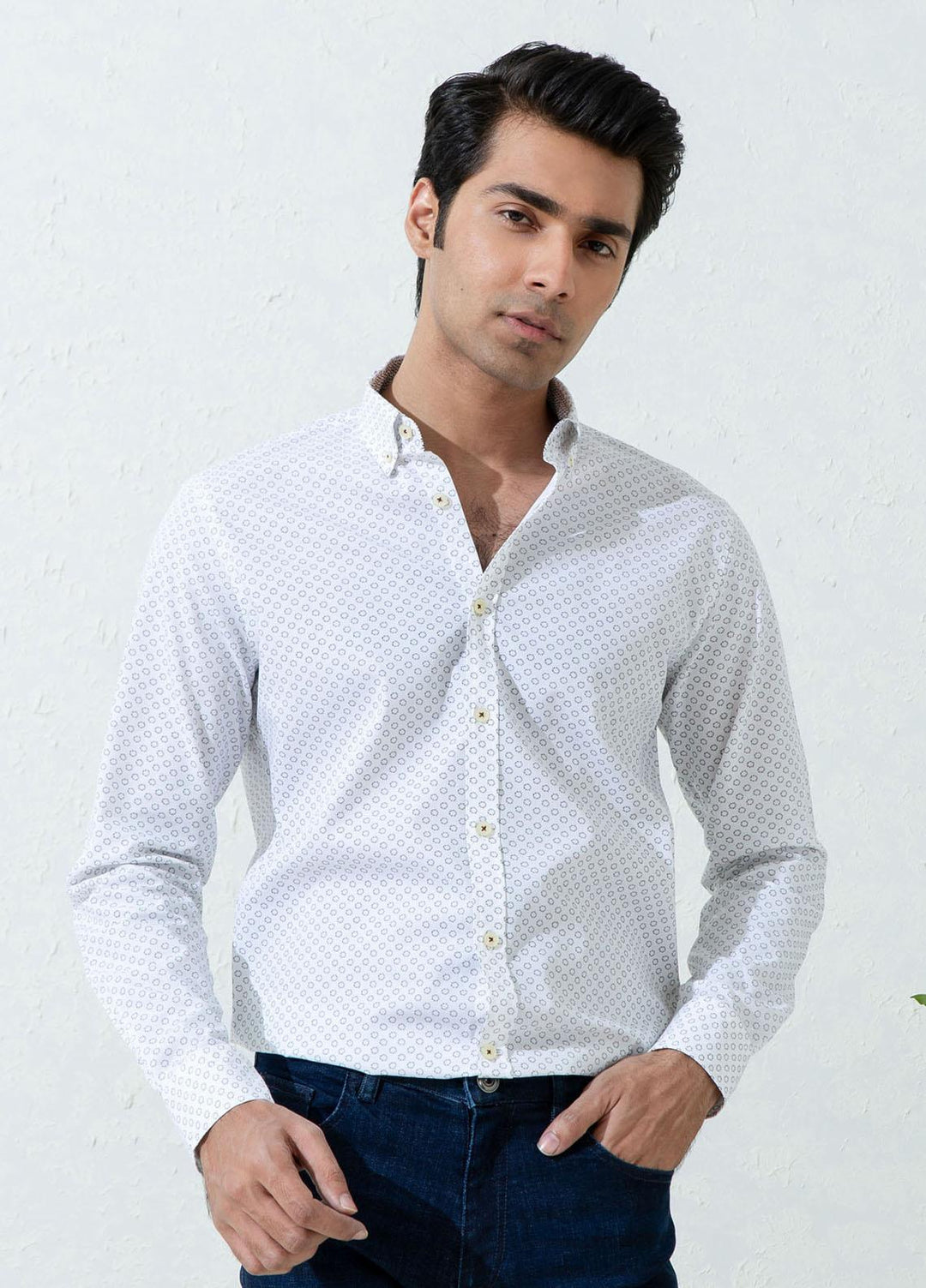 Brumano Cotton Casual Men Shirts - White Printed Shirt With Inner Collar Detailing