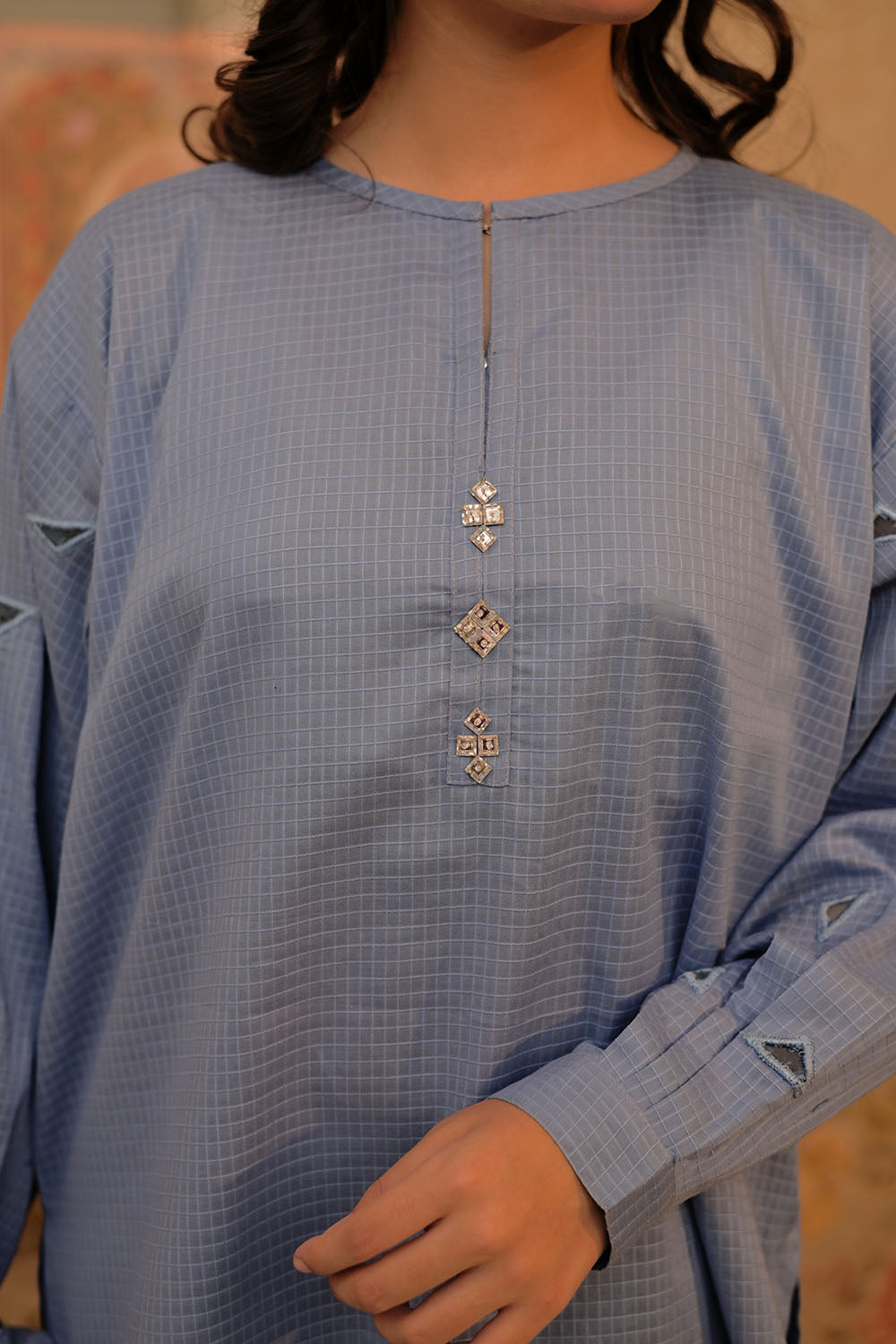 Straight, short shirt with round edge daman, having pleated cuff sleeves. Embellished with fancy beads. Paired with straight wide pants and dupatta.