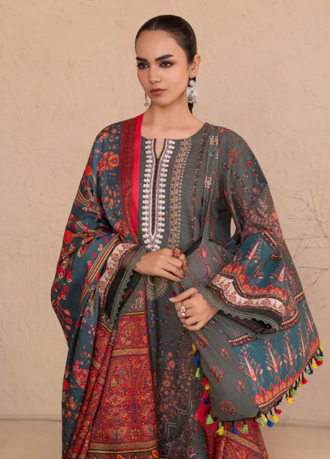 Additional Description: “Jagnu is the latest collection by Chandan Nagri, featuring intricate embroideries and rich, elegant prints. Paired with beautiful shawls, this collection is perfect for everyday looks with a touch of timeless style.” Dupatta accessories (tussles) are not included.