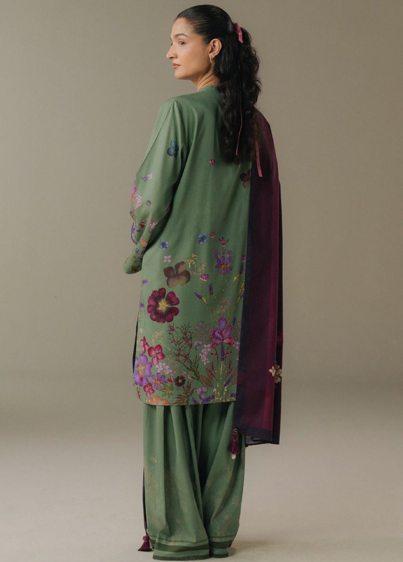 A hedge green shirt inspired by botanical motifs, paired with matching hedge green trousers featuring soft floral patterns. The ensemble is elevated with a deep purple shawl adorned with a blend of stripes and florals, adding a striking contrast and a touch of artistic sophistication to the look.