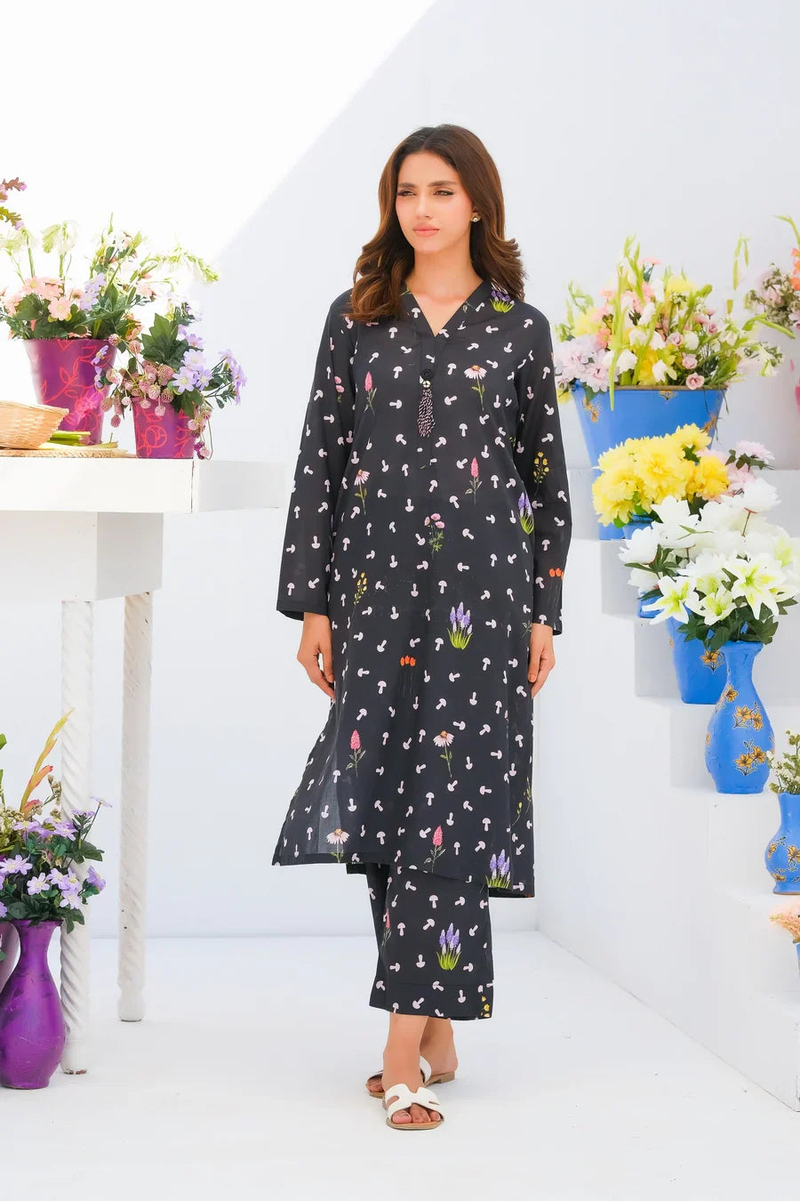 Step up your wardrobe with our exquisite printed Matching separates. This stunning 2-pc enhances intricate button detailing on the neckline of the shirt with convenient side pockets, and perfectly paired trousers.