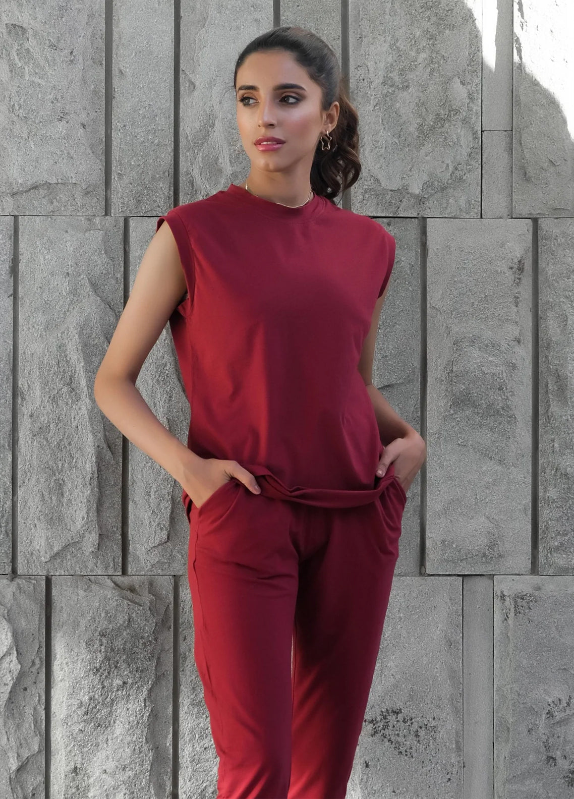 Dhaga Women Western Solids 2 Piece jersy Red Pear Co Ords Sleevesless DHSSSCO5 - Summer Collection