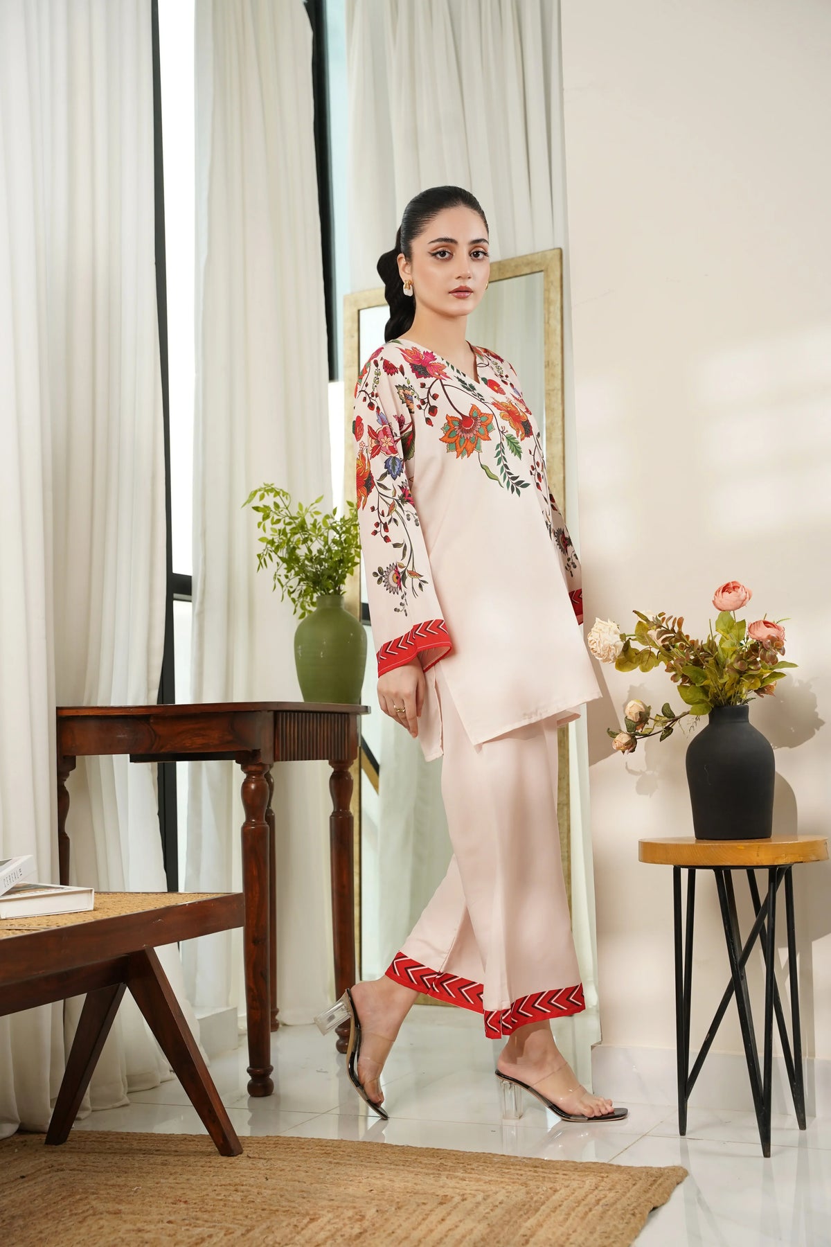 This 2 piece printed-colored co-ord set features luxurious and comfortable fabric and impeccable cuts given to every detail of the article, offering versatility and sophistication for any occasion.