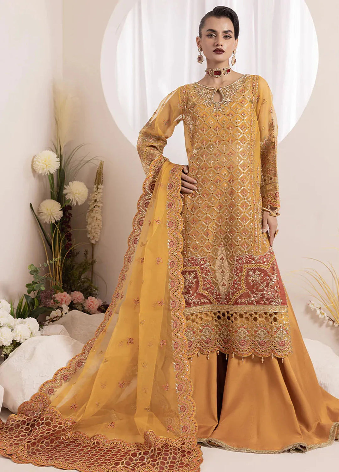 Diara Couture Pret Embroidered Net 3 Piece Suit US-607 Anarkali Mustard