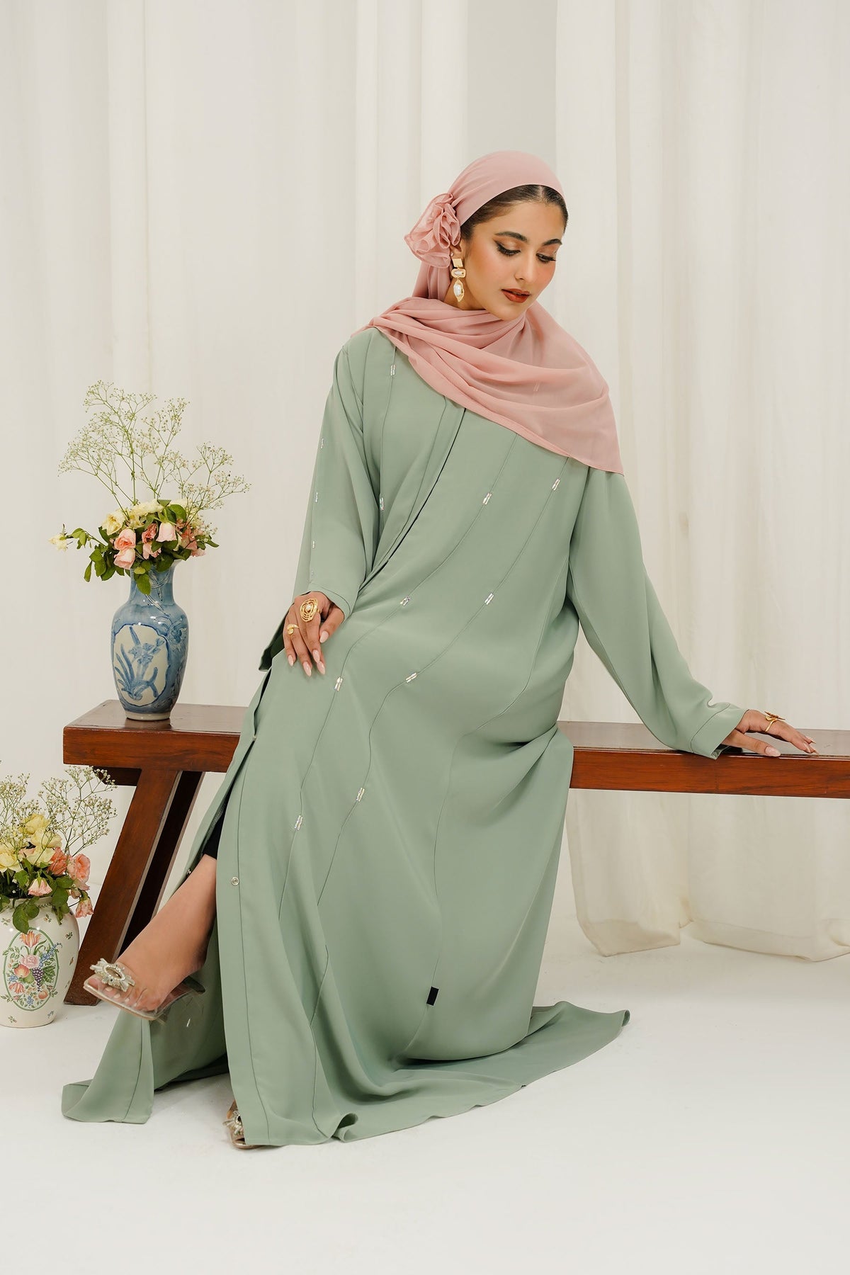 Design: This abaya features a straight-cut silhouette with hidden front buttons and delicate bead embellishments along vertical panel lines.