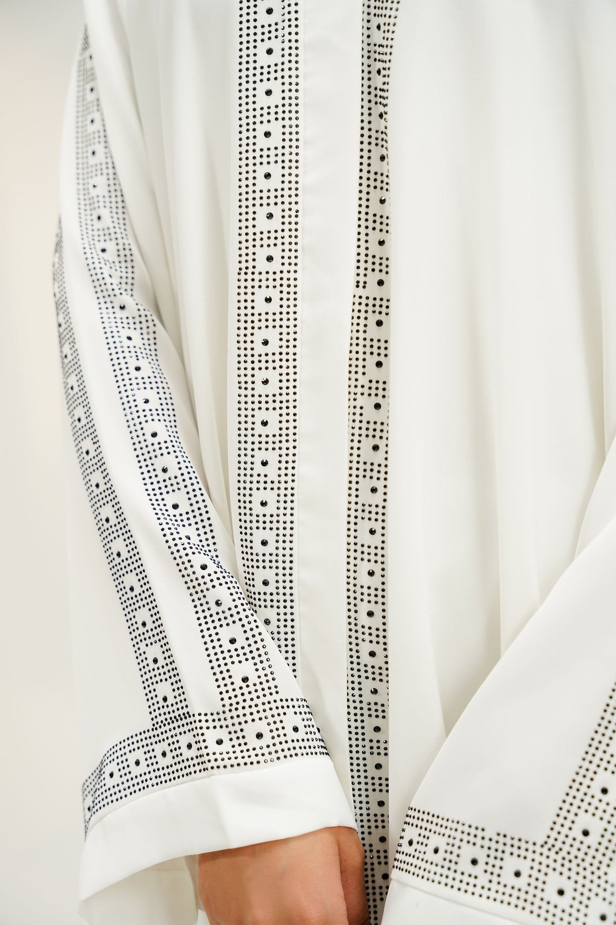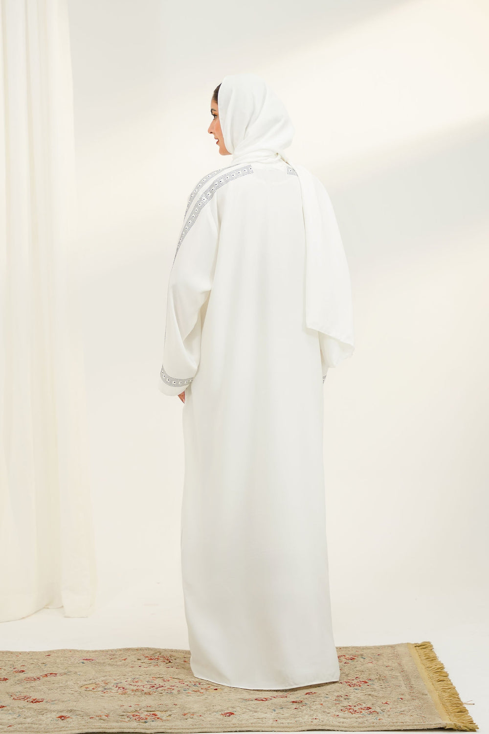 Design: This abaya features a straight-cut silhouette with intricate diamantes along the front open panel and sleeves, finished with hidden buttons