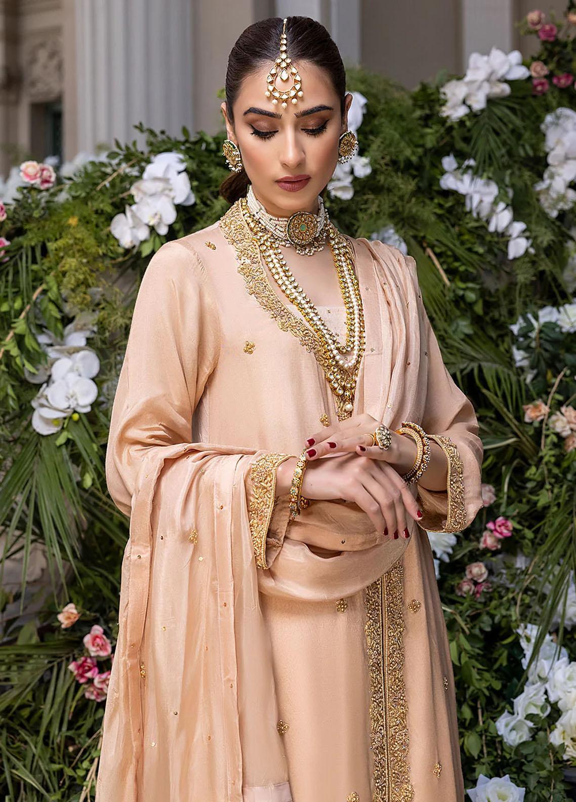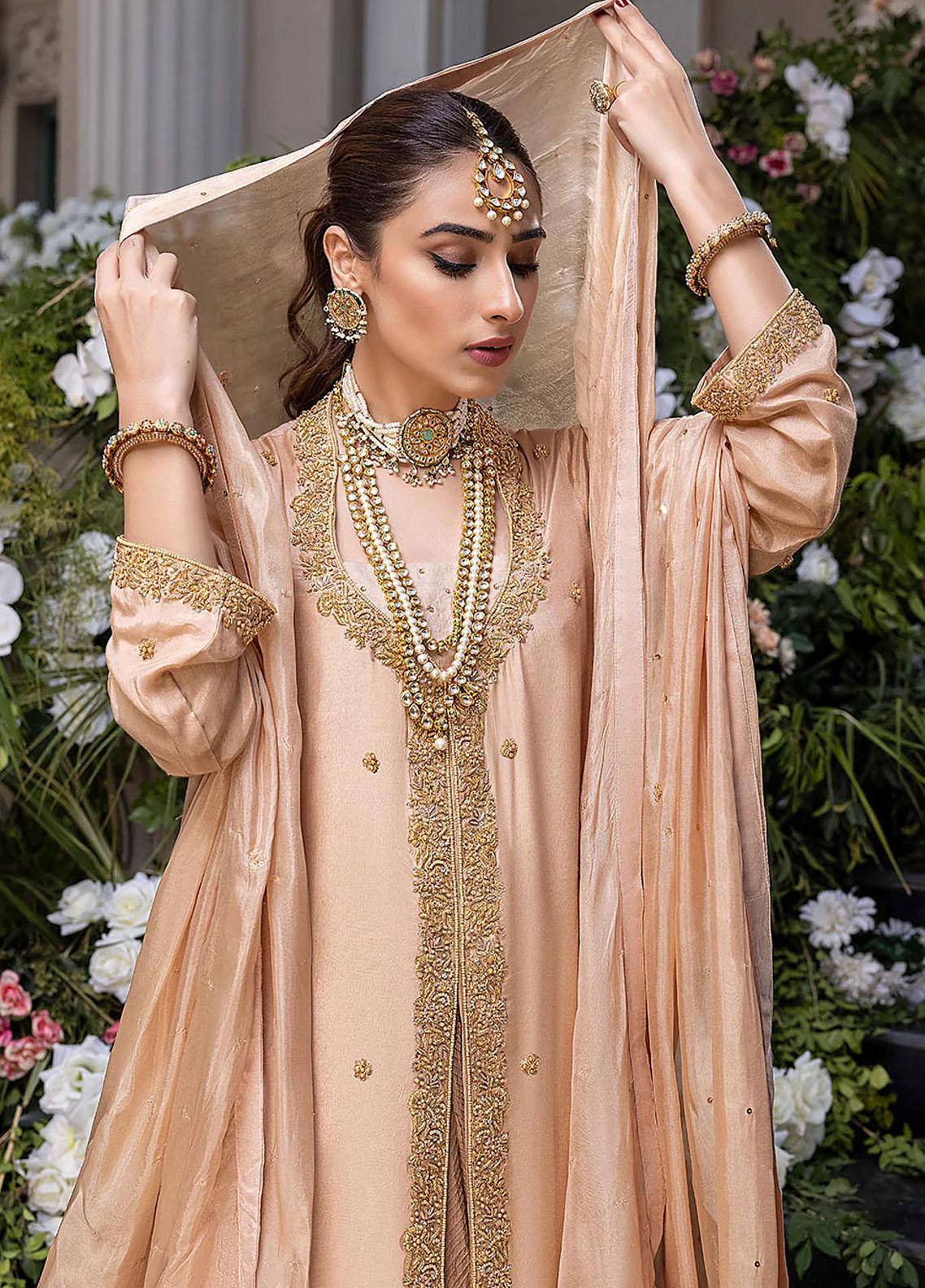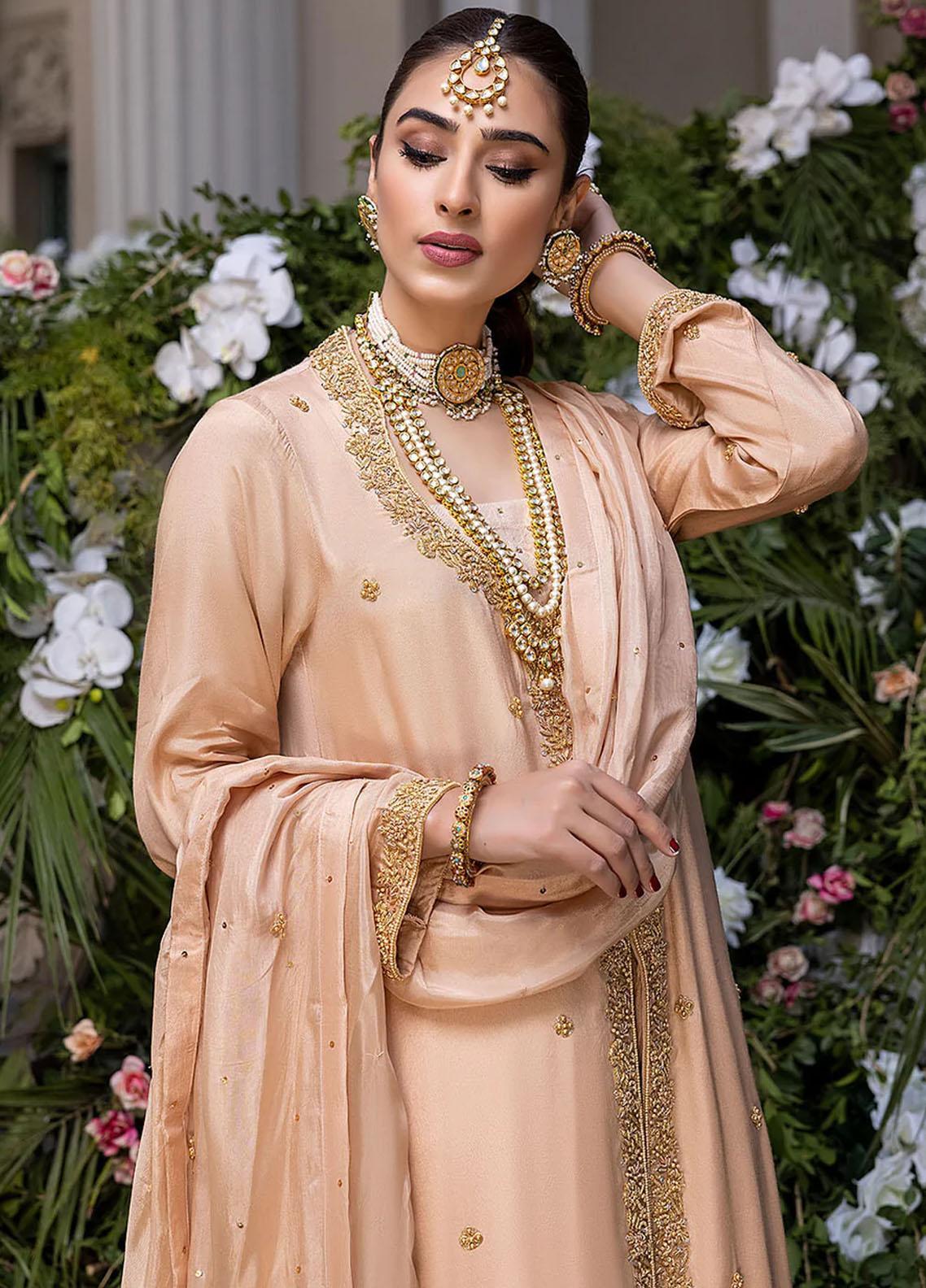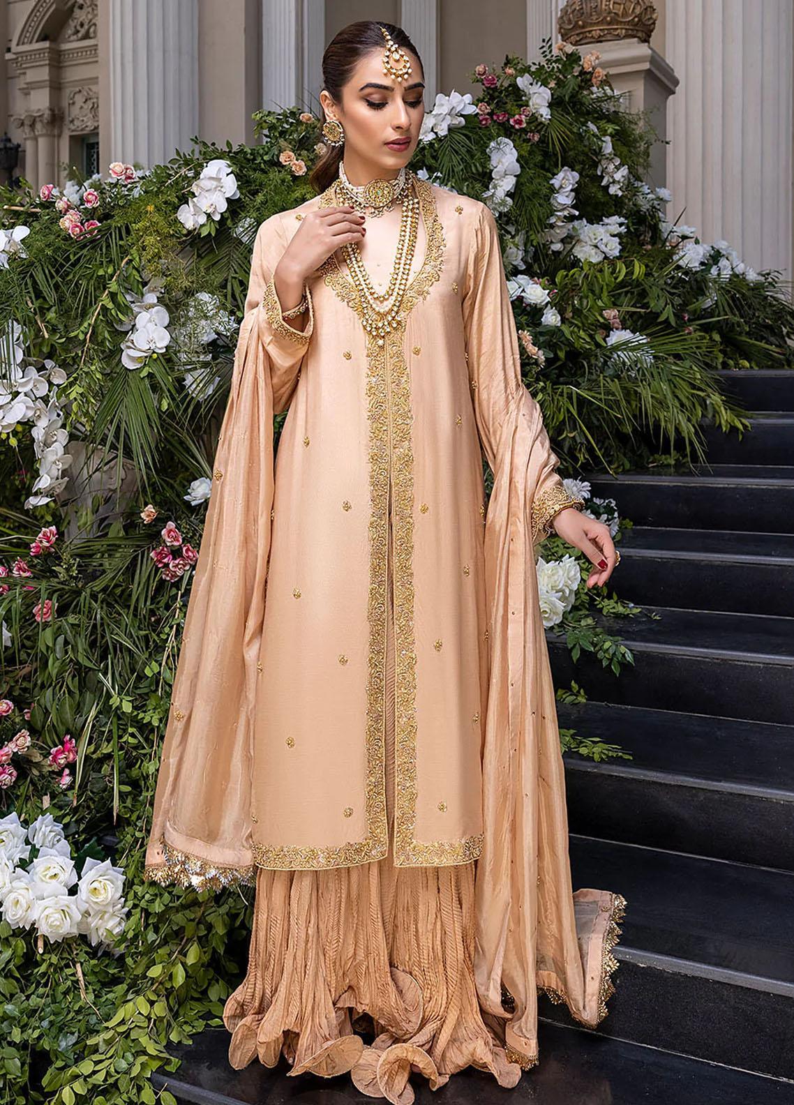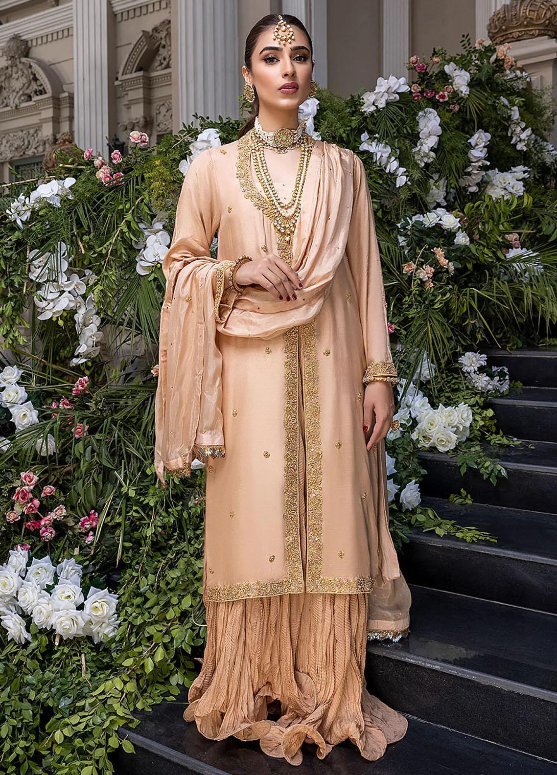 Magnolia is a marvelous silhouette that features an artistically adorned front open cotton silk shirt in a soft peach hue exuding elegance with sophisticated hand embellishments of kora, sequins, and pearls all over it. It is paired with a crushed silk sharara and a cotton silk dupatta decorated with Indian lace on pallu with sprinkled chan all over it to further enhanced the beauty of this attire. This outfit is a must have for this wedding season
