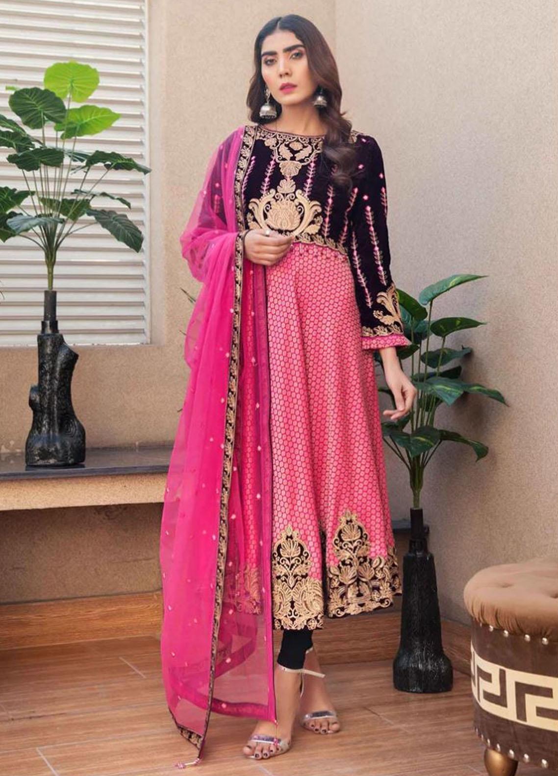 An exquisetly embellished rubi jamawar frock laden with golden thread and sequince embroidery, hand detailing. It comes with an intricately four sided net embroided dupatta, hanged with tassels