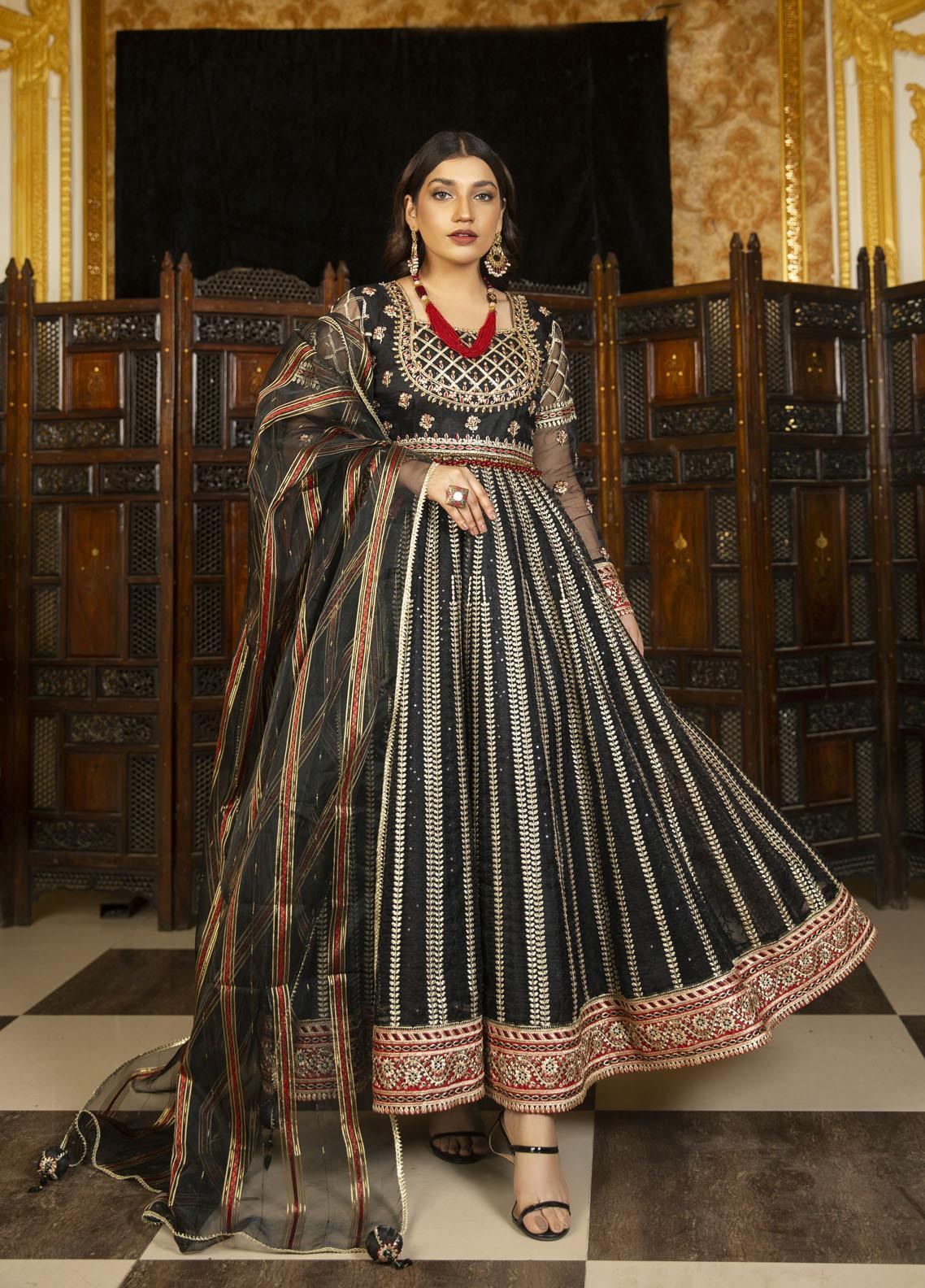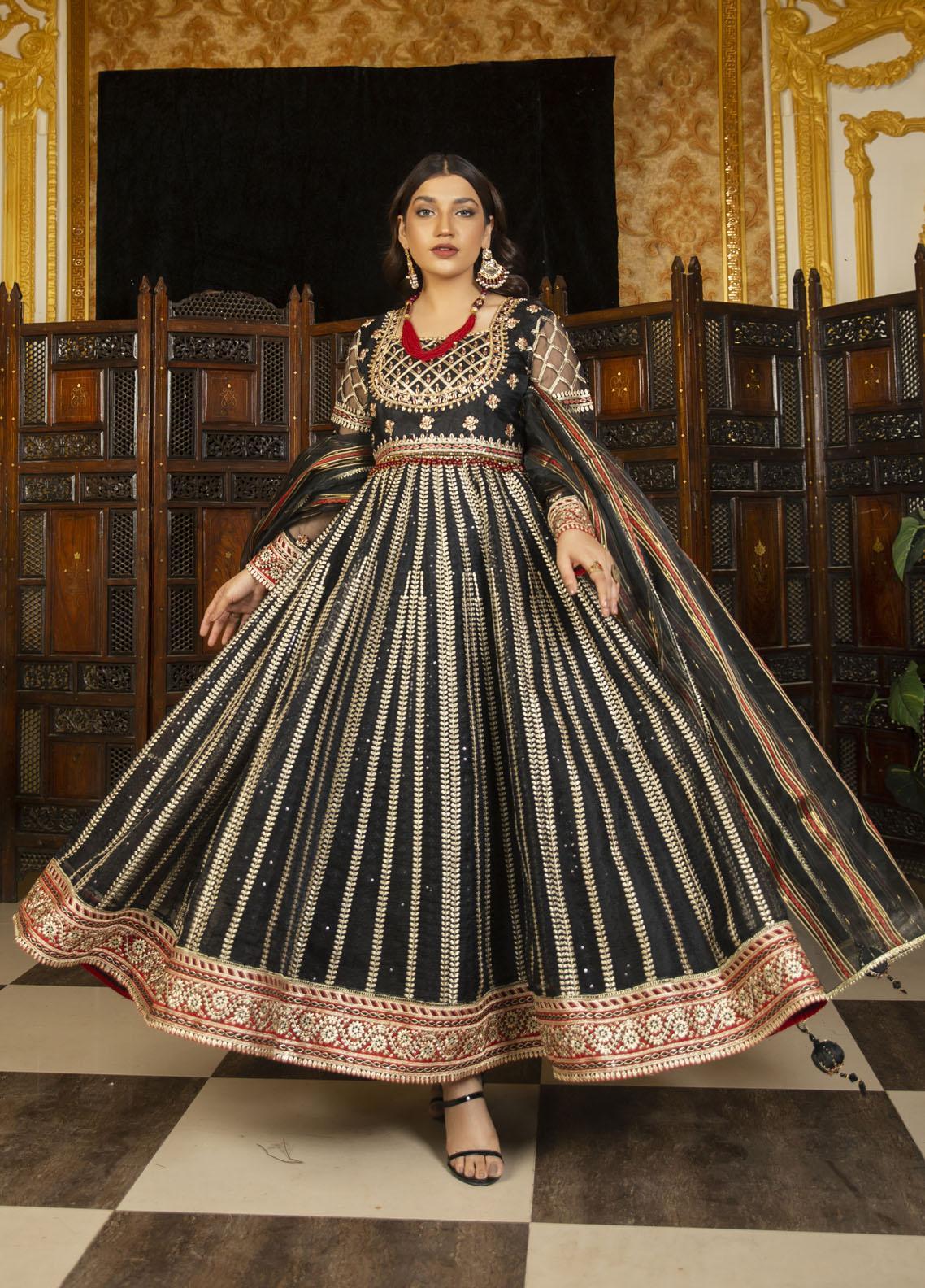 An Organza frock artistically illustrated with machine embroidery, continuing fine detail embellishment on the body, and banarsi organza dupatta with traditional handmade trendy tassel