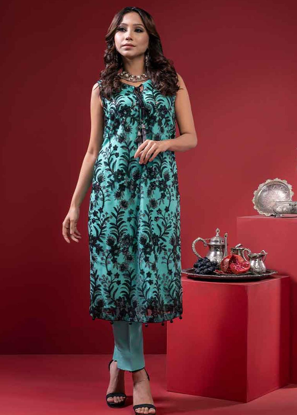 Two piece with shirt in net fabric featuring beautiful black froral thread work. It comes with straight trouser in pure silk. It also features tussel and lace detail on the shirt.