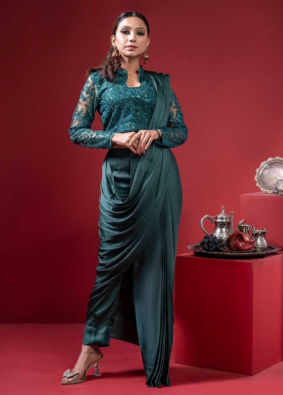 Three piece paint sari. The blouse, a timeless piece features all over thread work on net fabric. Zip enclousre at tha left hand side of the blouse. Also includes trouser and sari in pure silk fabric.