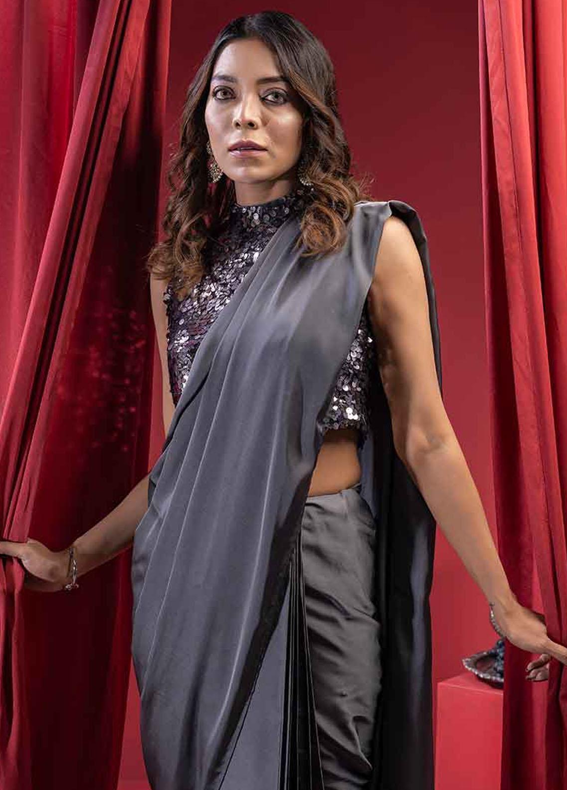 Three piece paint sari. The blouse, a timeless piece features all over sequences in net fabric. Zip enclousre at tha back of the blouse. Also includes trouser and sari in pure silk fabric.
