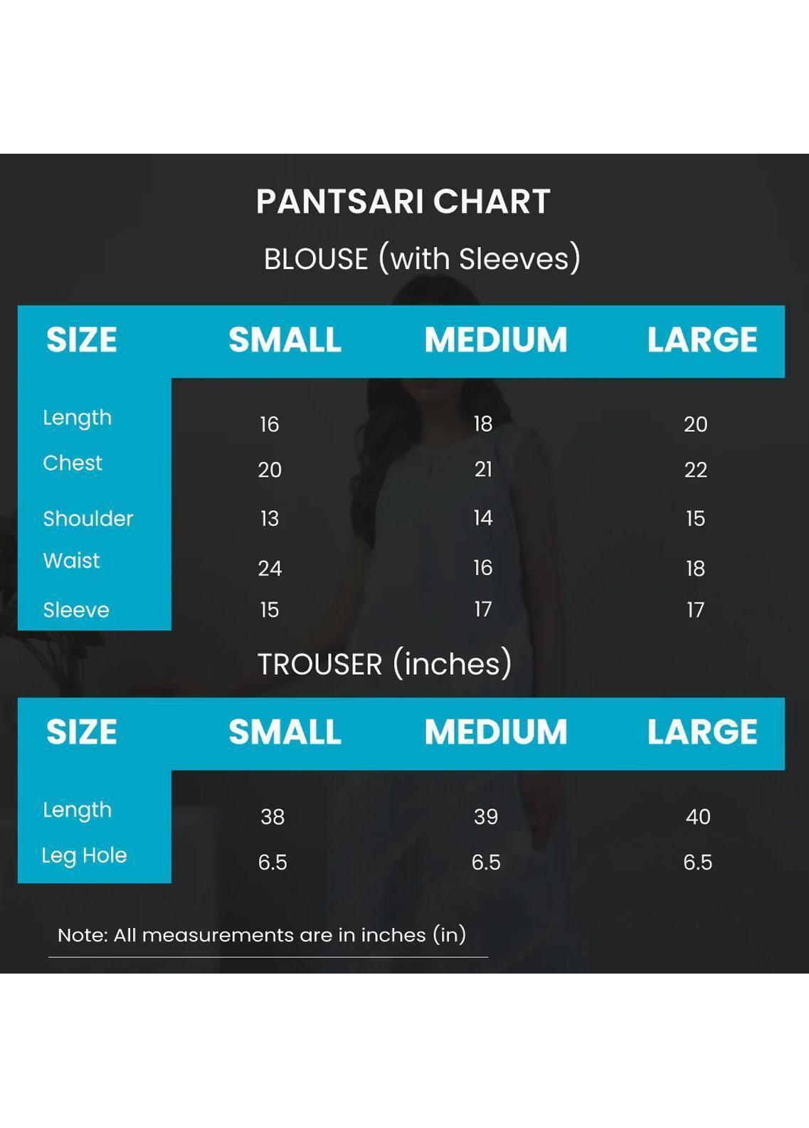 Three piece paint sari. The blouse, a timeless piece features all over sequences in net fabric with full sleeves. Zip enclousre at tha left hand side of the blouse. Also includes trouser and sari in pure silk fabric.