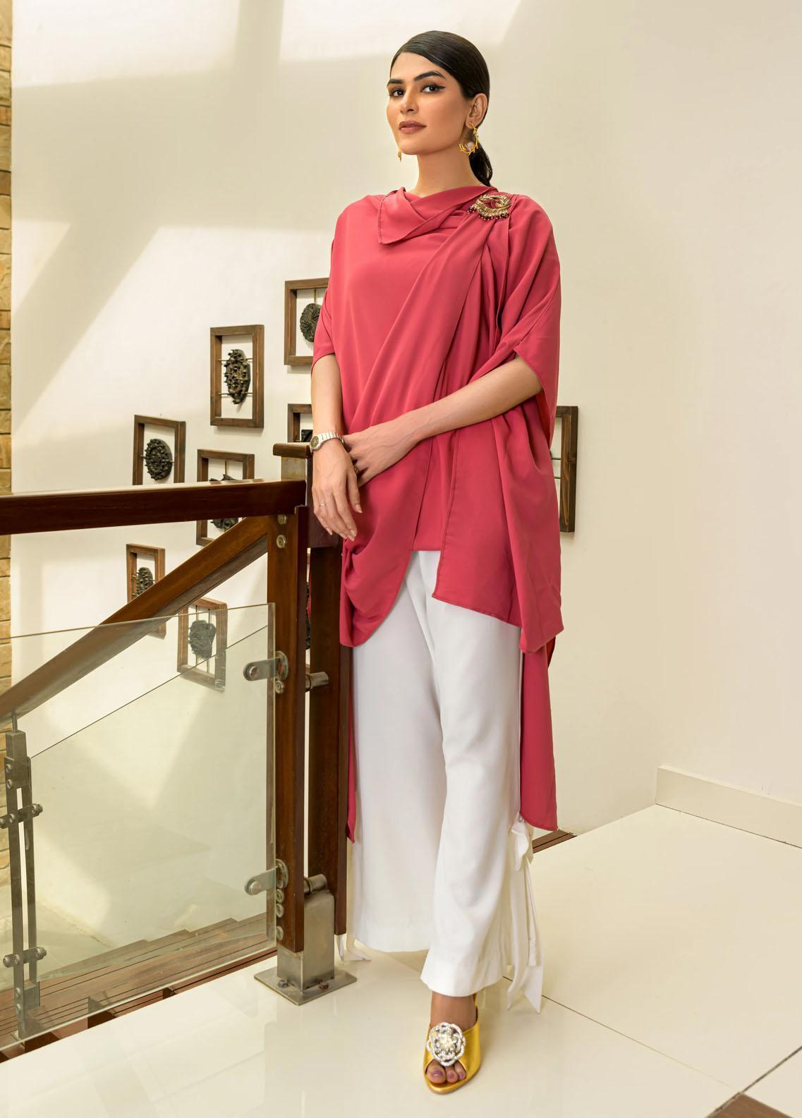 This fusion top is made with rosewood pink soft silk fabric. It features wrap-around silhouette with brochure detail on one side. Model is wearing small size model height is 5 8 Inches.