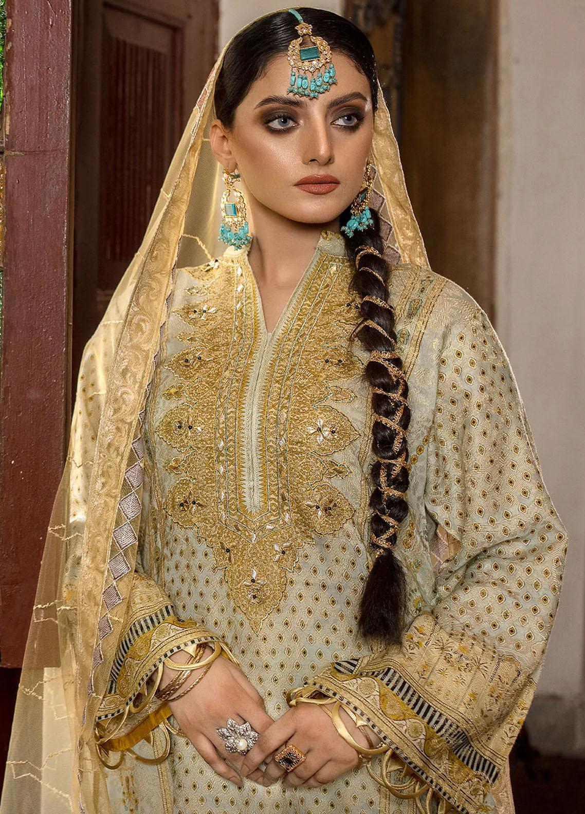• Embroidered jacquard cotton shirt adorned with gotta and beads work on neckline. The overall look is completed with stylish lace work on sleeves and daman,