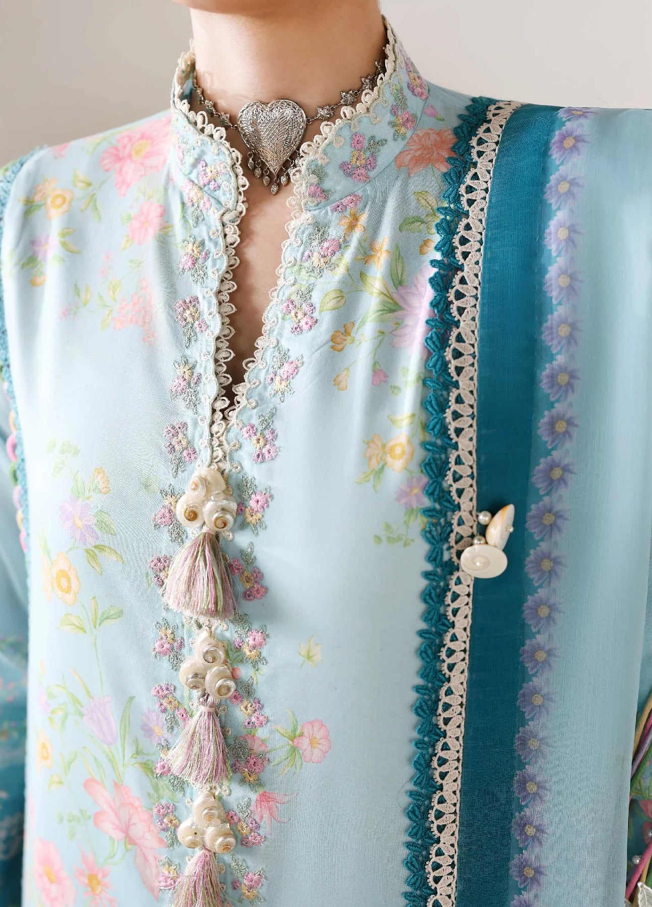 Blue printed lawn with a flowy chiffon dupatta, beautifully finished with floral embroidery on the neckline and sleeve for a fresh and feminine touch.