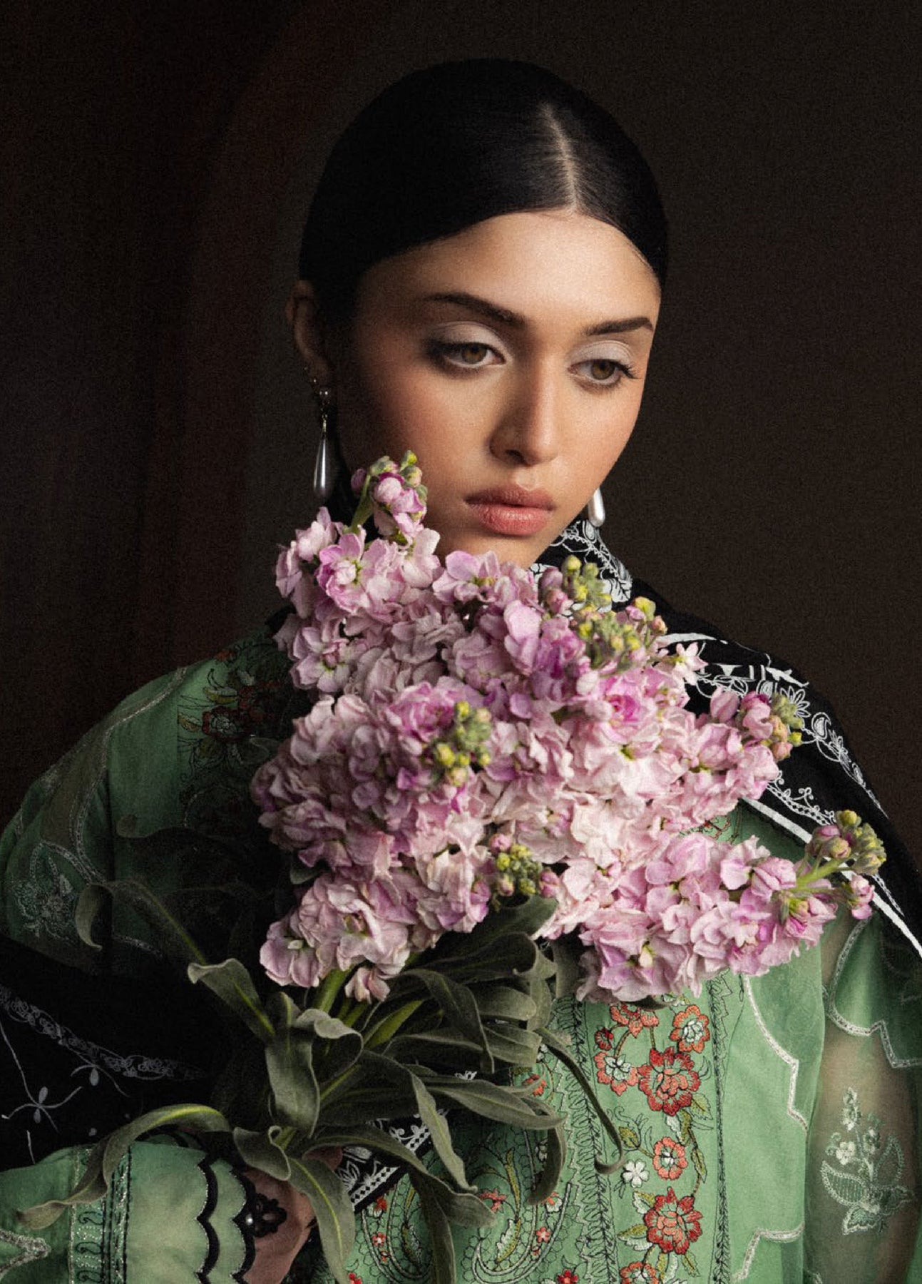 Midoriya is crafted in sage green, adorned with bohemian floral, paisley, and jaali patterns brought to life through laser and hand embroidery. Paired with a black embroidered dupatta, detailed organza borders, and matching embroidered cambric trousers, the ensemble exudes a harmonious blend of sophistication, tradition, and understated luxury.