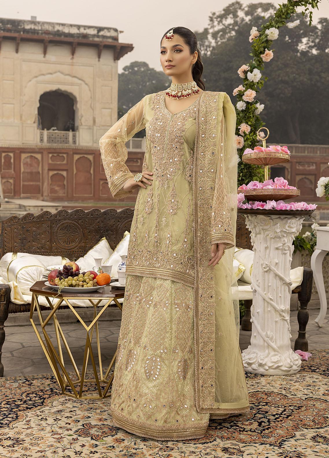 3 Piece Embroidered Net Suit 1 Embroidered Front With Hand Work W30 By 40H On Net. 1 Embroidered Back With Hand Work W30 By 40H On Net. 1 Embroidered Sleeves With Hand Work W44 By 22H On Net. 1 Embroidered Neck Line With Hand Work On Net. 1 Embroidered Dupatta With Hand Work 2.75Yards On Net. 16 Embroidered Kali.S With Hand Work For Lehenga On Net. 1 Cotton Silk Fabric For Trouser 2.50 Yards